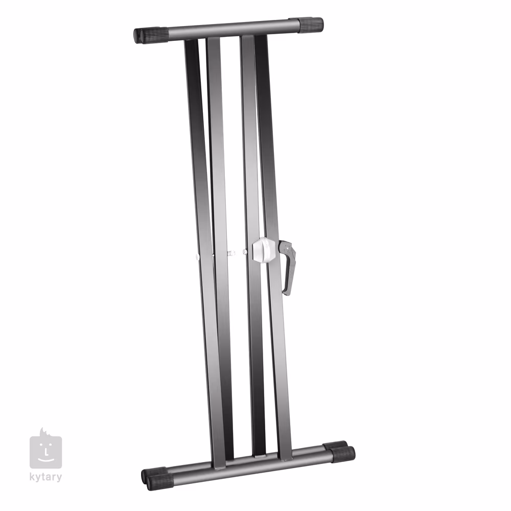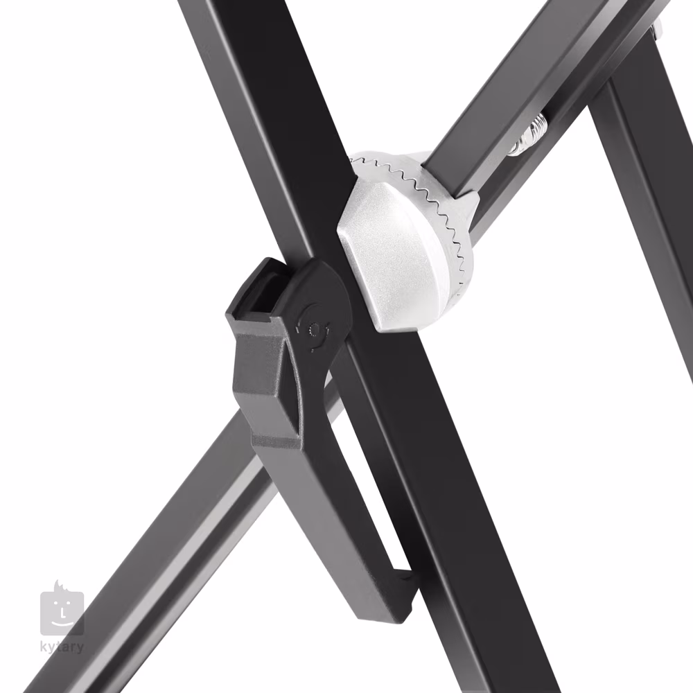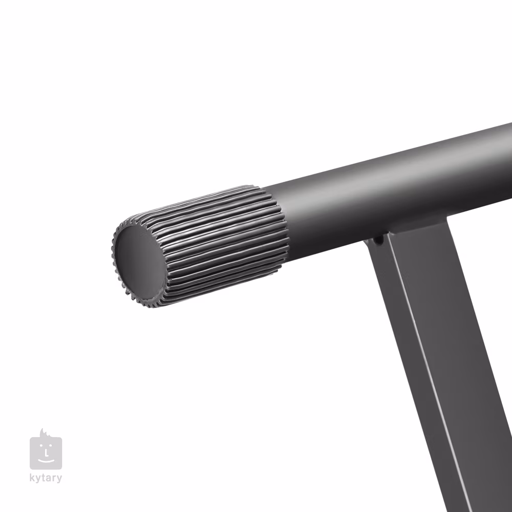Stalowy statyw pod keyboard z konstrukcją X, podwójnym usztywnieniem i regulowaną wysokością za pomocą śruby szybkomocującej. Oczywiście gumowe osłony krawędzi chronią instrument przed uszkodzeniem i zapobiegają przesuwaniu się.