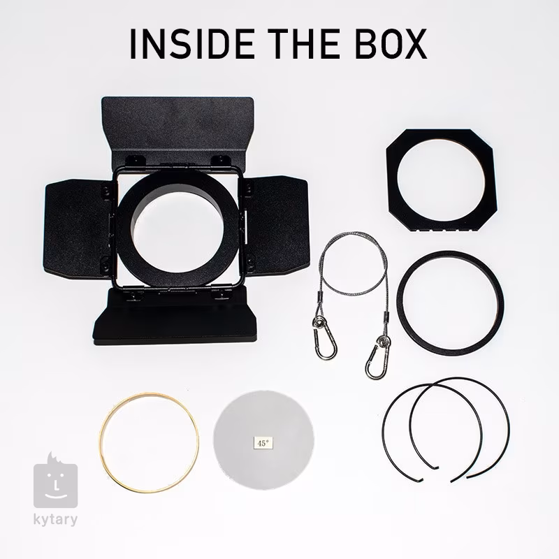 Odbłyśnik zapewnia stały kąt świecenia wynoszący 19°. W zestawie znajduje się jednak również wymienna soczewka o szerszym kącie wiązki 45°. Wiązkę światła można dodatkowo regulować za pomocą drzwi kierunkowych, które również znajdują się w zestawie. Jeśli potrzebujesz kolorowego oświetlenia, przyda Ci się żelowa ramka do włożenia kolorowych lub szronionych filtrów. Oprawa jest wyposażona w elektroniczny ściemniacz, który umożliwia ręczne ściemnianie za pomocą potencjometru lub zdalne ściemnianie za pomocą protokołu DMX i ściemniacza TRIAC.