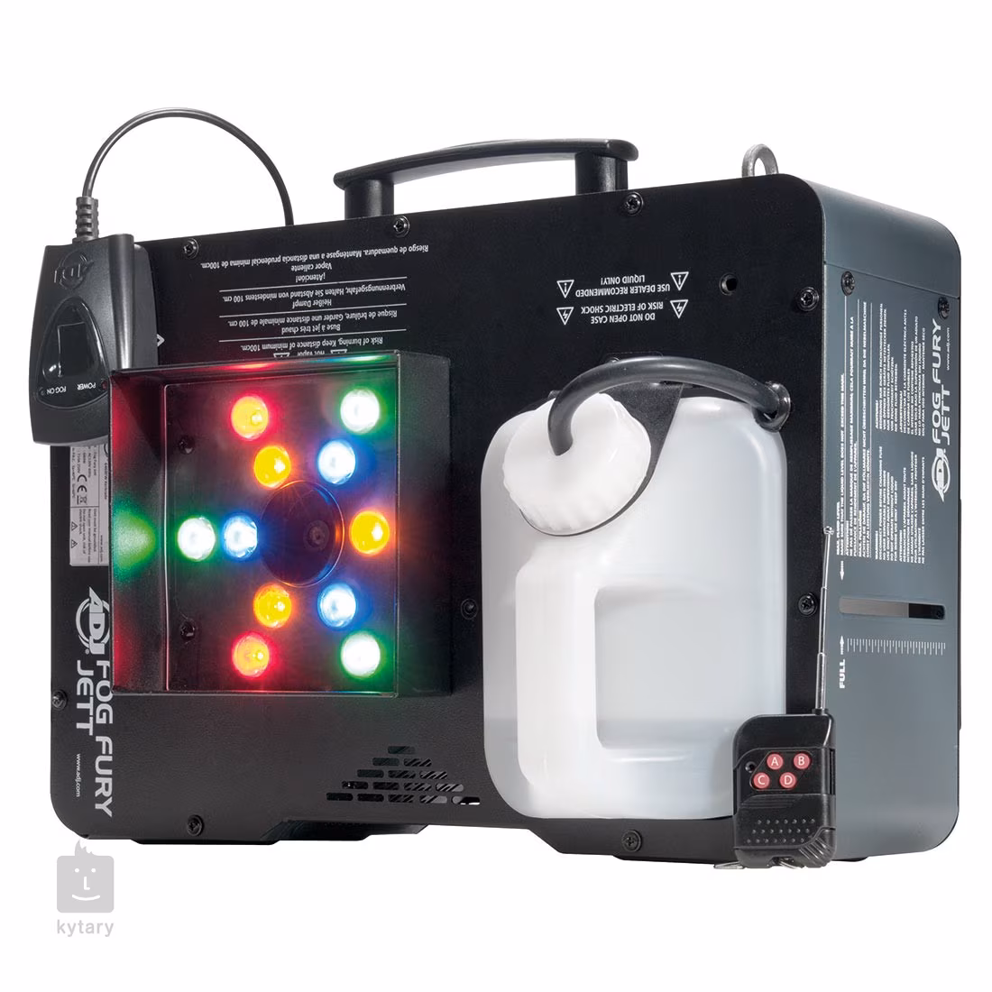 ADJFog Fury Jett to podświetlana diodami LED wytwornica mgły, która dodaje kolor do mgły z dwunastu 3W diod LED RGBA (3x czerwony, 3x zielony, 3x niebieski, 3x bursztynowy). Urządzenie może być ustawione w różnych kierunkach, aby wykorzystać poziomą i pionową produkcję mgły.