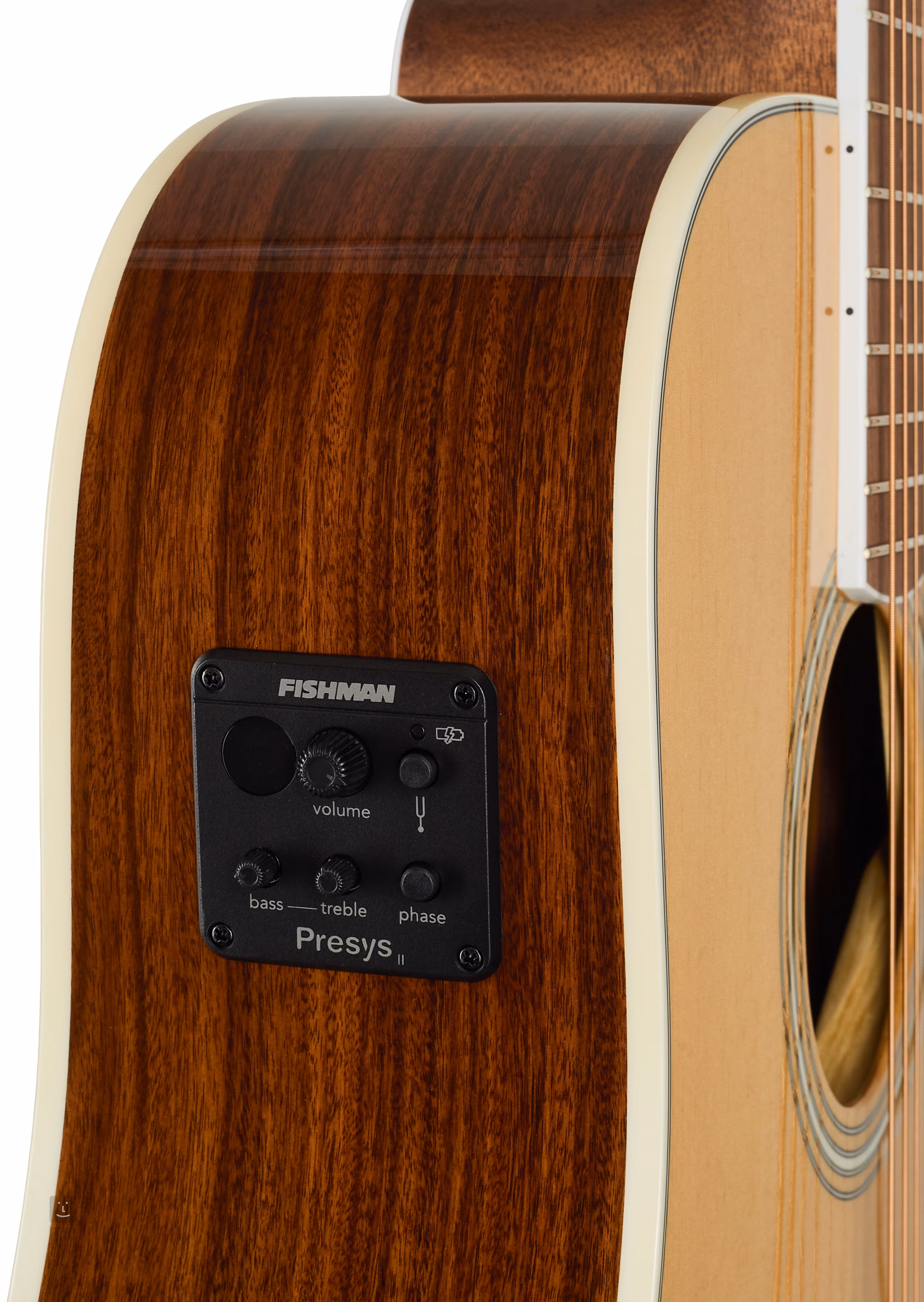 Możliwość nagłośnienia zapewnia elektronika Fishman Presys II z regulatorem głośności, dwupasmowym korektorem, inwerterem fazy i wbudowanym stroikiem. Struny są zamocowane przez zerowy i siodełkowy próg z kości w niklowych mechanizmach marki Grover i mostku z pau ferro. Stylowe wykończenie podkreśla przezroczysta płytka ochronna, dwustronna obwódkowa lamówka korpusu, czarno-biała wkładka na górze i rozeta złożona z czarno-białych linii.