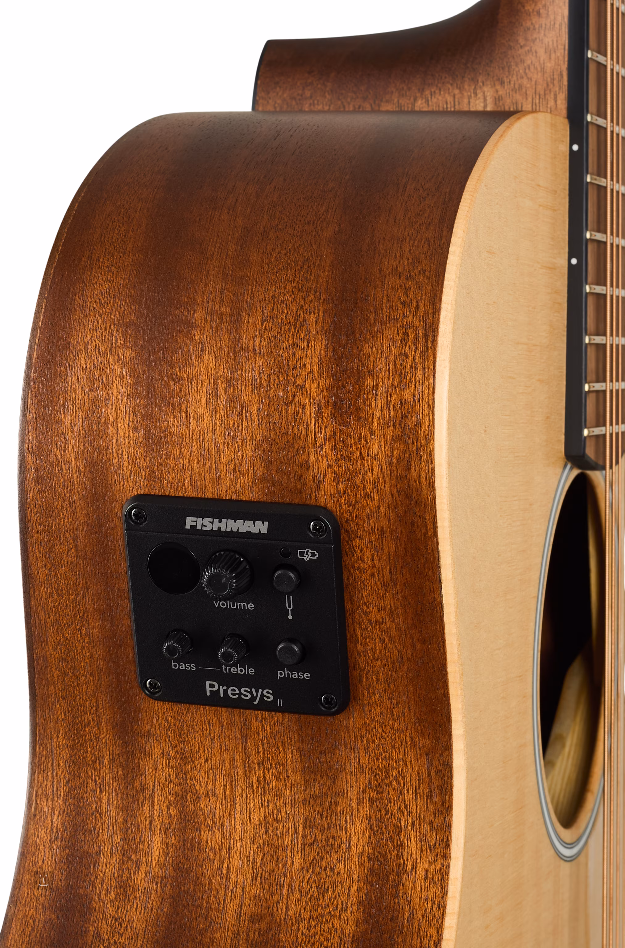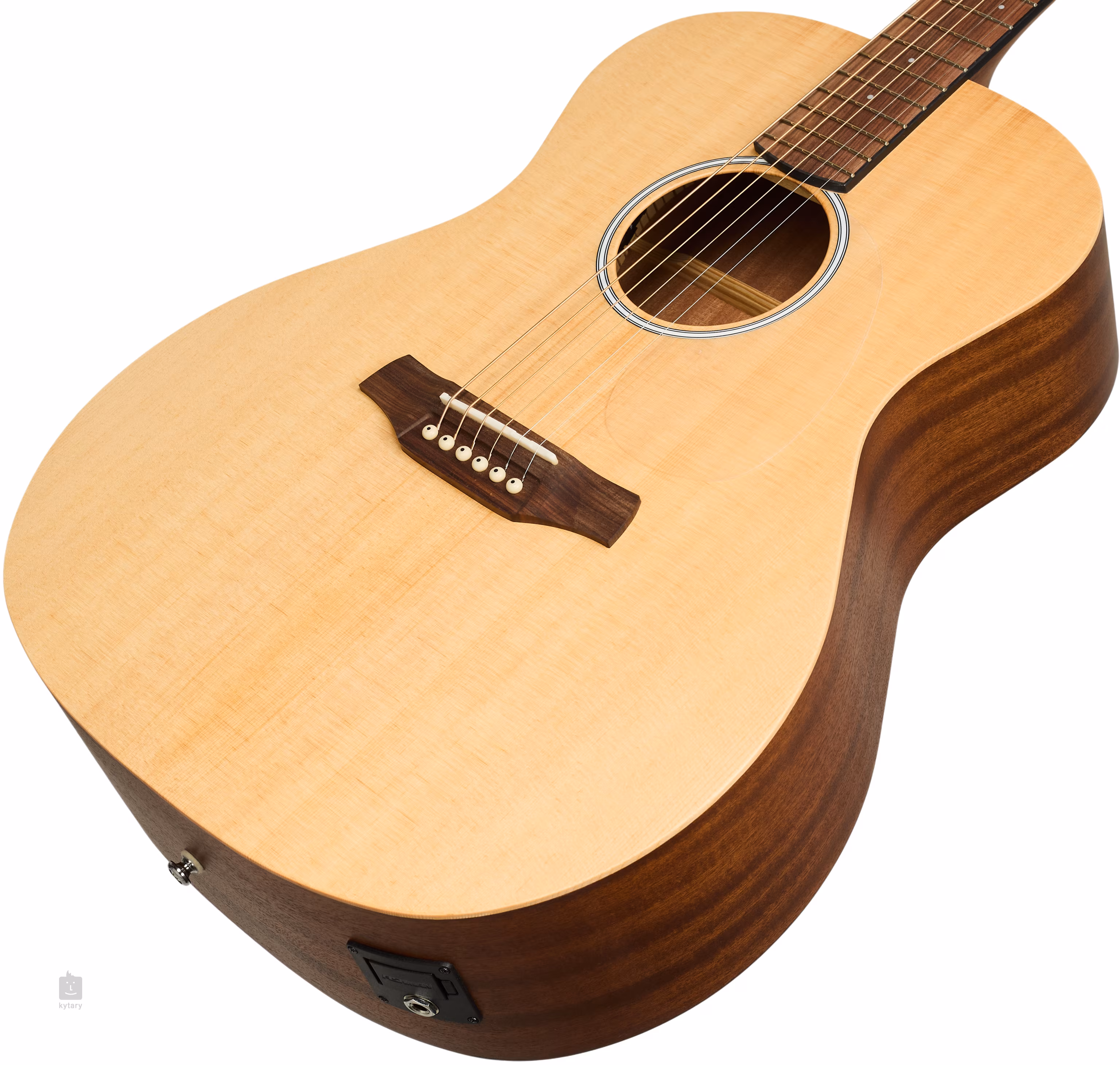 Możliwość nagłośnienia zapewnia elektronika Fishman Presys II z regulatorem głośności, dwupasmowym korektorem, inwerterem fazy i wbudowanym stroikiem. Struny są zamocowane przez zerowy i siodełkowy próg z kości w chromowanych mechanizmach die-cast i mostku z pau ferro. Skromne, ale stylowe wykończenie podkreśla przezroczysta płytka ochronna i rozeta złożona z czarno-białych linii.