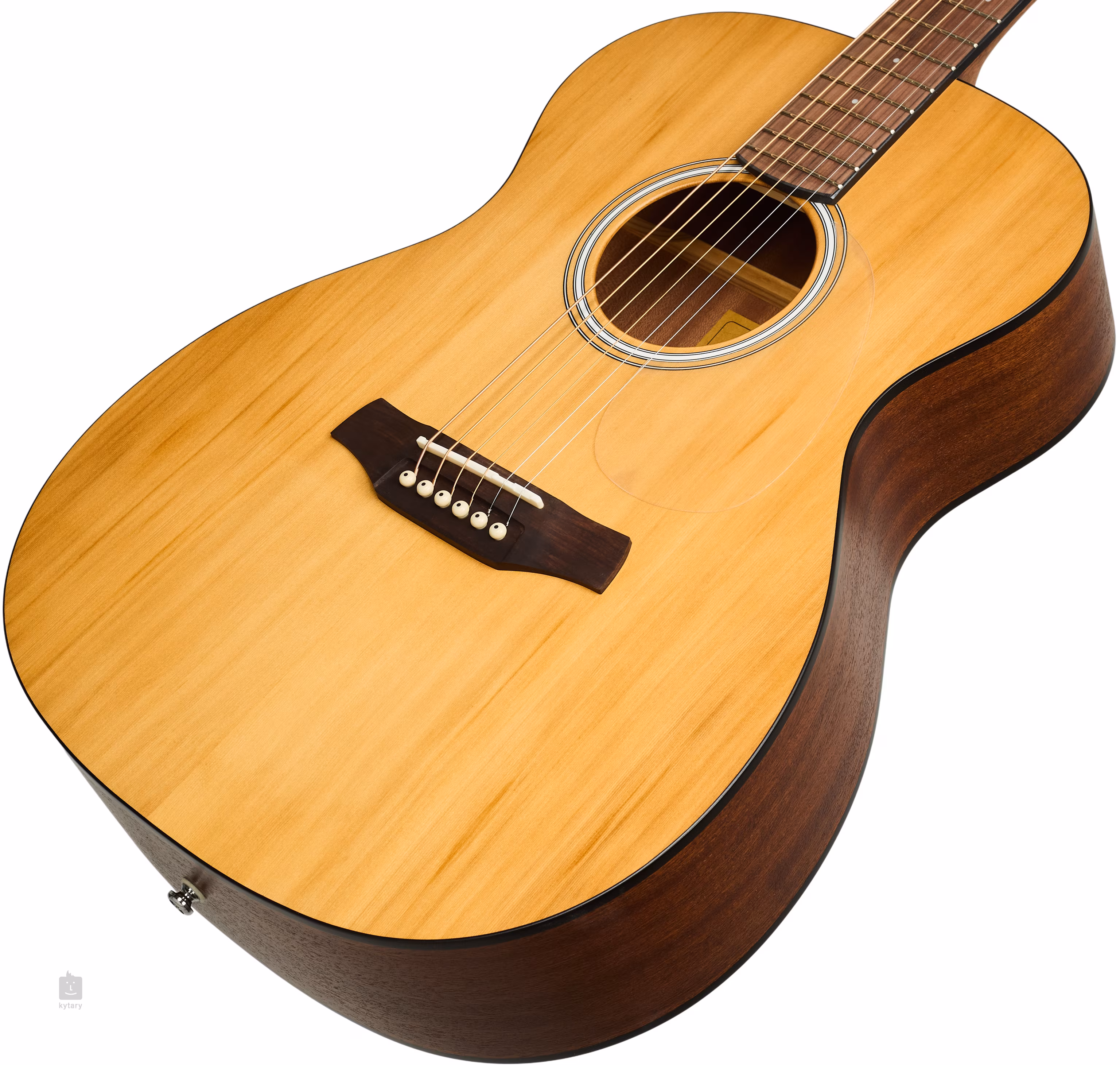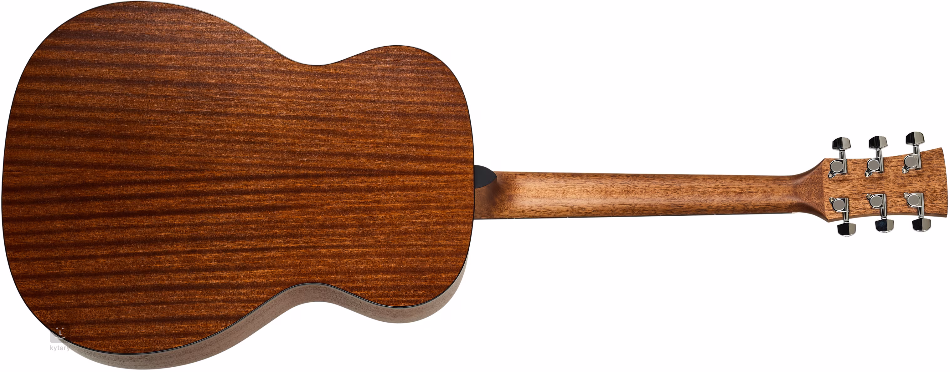 Struny są zamocowane przez zerowy i siodłowy próg z kości w chromowanych mechanizmach die-cast i mostku z pau ferro. Skromne, ale stylowe wykończenie podkreśla przezroczysta płytka ochronna, czarna obwódka korpusu i rozeta złożona z czarno-białych linii.