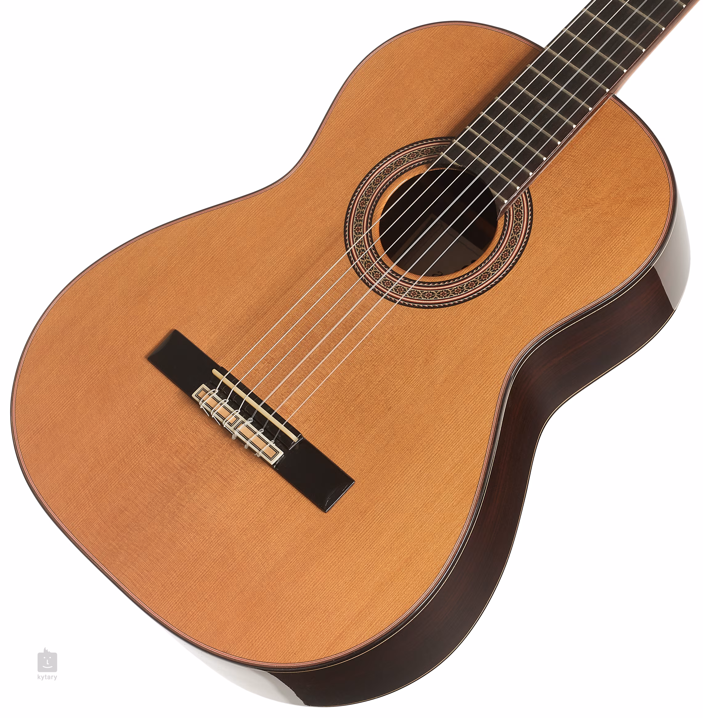 Gitara klasyczna Admira ADM50 to w pełni masywny, ręcznie wykonany instrument, który przypadnie do gustu nawet najbardziej wymagającym muzykom. Przód gitary wykonany jest z litego cedru, a tył i boki z litego palisandru. Szyjka z afrykańskiego mahoniu posiada hebanowe usztywnienie, a podstrunnica jest palisandrowa. Dobre strojenie gwarantuje mocowanie strun w wysokiej jakości klasycznej mechanice ze złotym wykończeniem i palisandrową podstrunnicą. Stylowe wykonanie podkreślają tradycyjne elementy w postaci rozety, wielowarstwowego drewnianego bindingu i logo firmy na główce.