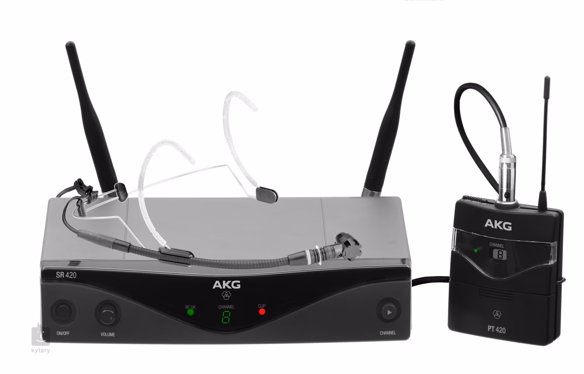 Zestaw składa się z odbiornika SR420, nadajnika ręcznego PT420 i mikrofonu nagłownego.