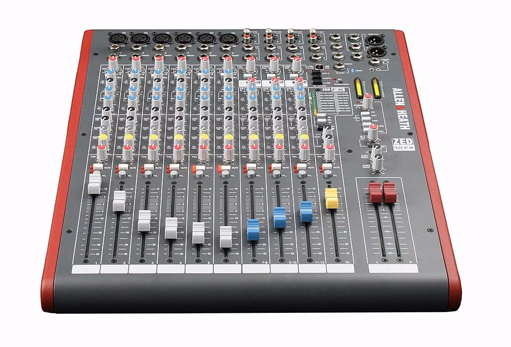 ZED-12FX posiada sześć wejść mikrofonowych/liniowych i trzy wejścia liniowe stereo. Nie brakuje również 2x AUX pre-fader i 2x AUX post-fader, z których jeden jest używany dla wewnętrznej jednostki efektowej. Wszystkie wejścia mikrofonowe są wyposażone w 3-pasmowy korektor z przełączanymi środkami (wejścia liniowe mają tylko 2-pasmowy korektor). Wstawianie kanałów mikrofonowych jest oczywistością, z pewnością ucieszy również wstawianie głównych wyjść, co nie jest zbyt powszechne w przypadku konsol o tak małych rozmiarach. Nie brakuje również klasycznych złączy REC OUT i 2TRK RTN do podłączenia urządzeń nagrywających i odtwarzających. Ciekawostką jest wyjście ALT OUT poprzez złącza CINCH, które nadaje się do podłączenia monitora w miejscu pracy realizatora dźwięku. Podobnie jak wszystkie miksery serii ZED, ZED-12FX posiada port USB do połączenia z komputerem.