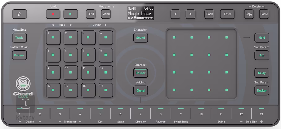 AlphaTheta Chordcat to przenośna stacja groovebox zaprojektowana z myślą o natychmiastowej inspiracji i tworzeniu oryginalnych utworów. Dzięki unikalnemu trybowi Chord Cruiser oferuje do 110 000 kombinacji akordów, aby pomóc w tworzeniu unikalnych progresji. Intuicyjny przepływ pracy ułatwia słuchanie polecanych akordów, zapisywanie ulubionych i płynne łączenie ich w progresje. Wskaźnik LED pokazuje również, które nuty odpowiadają ustawionej tonacji i skali, co docenią zarówno początkujący, jak i profesjonalni muzycy.