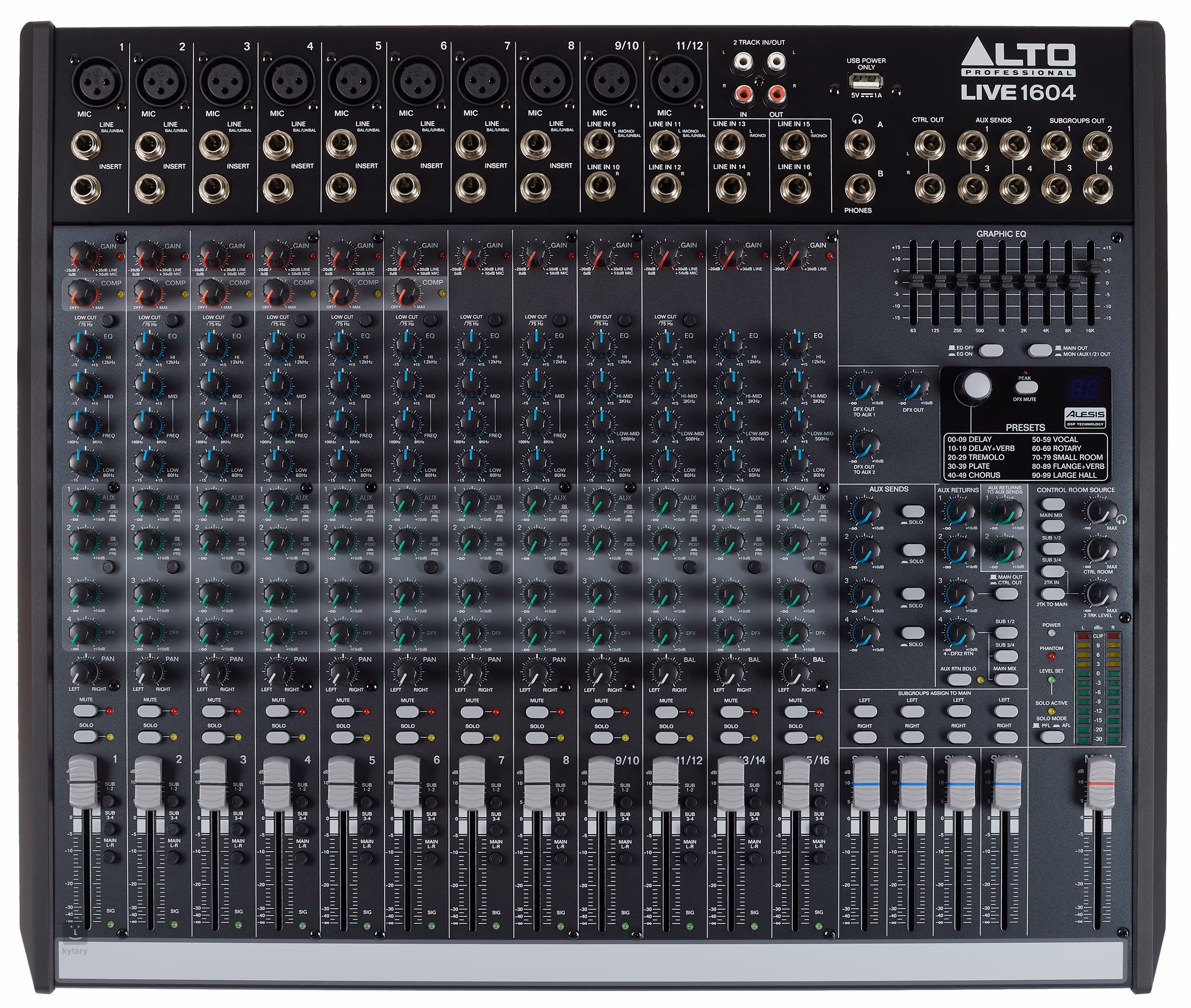 Alto Live 1604 Ten 16-kanałowy mikser jest doskonałym wyborem dla dużych wydarzeń kulturalnych, konferencji lub studiów. Posiada dziesięć wejść mikrofonowych z zasilaniem phantom, gdzie można dodatkowo dostosować sygnał wejściowy za pomocą trzypasmowego korektora. Dodatkowo, wejścia 1-6 posiadają potężny kompresor. Pozostałe wejścia obejmują łączność stereo z regulacją wzmocnienia/zbalansowania, trzypasmowy korektor i stereofoniczne gniazda Jack/RCA, które można wykorzystać do podłączenia odtwarzacza CD/MP3.