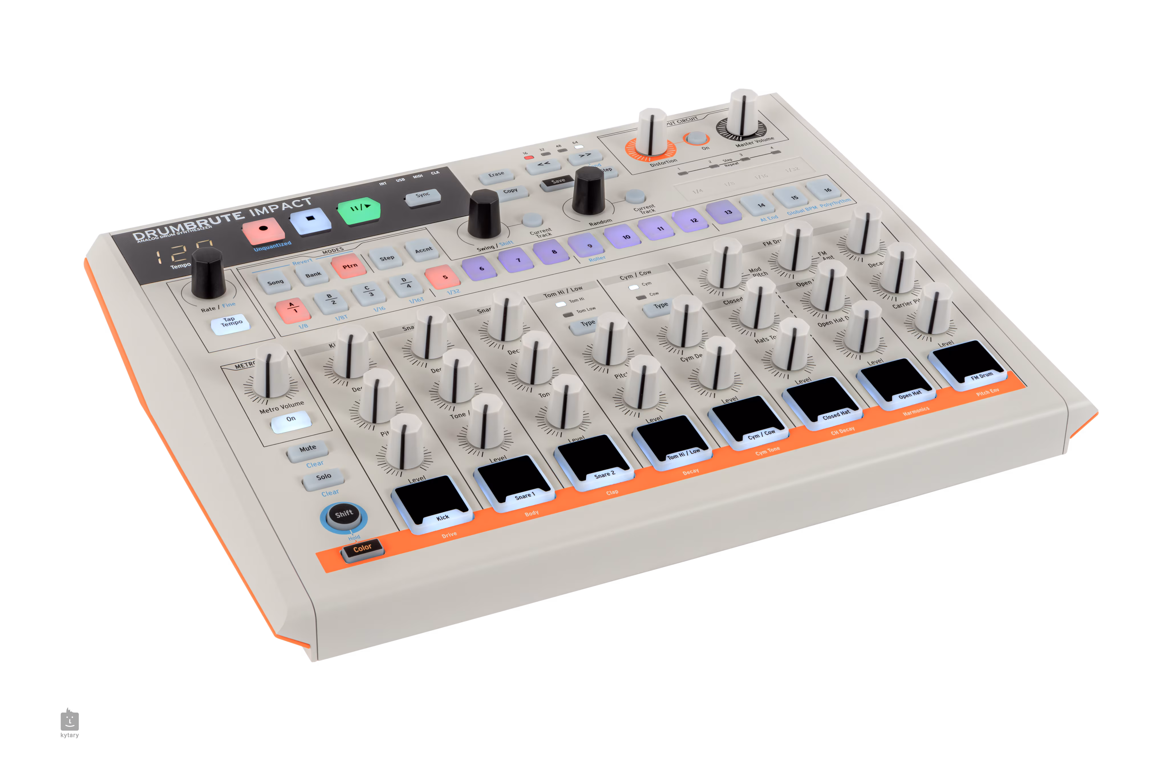 Arturia DrumBrute Impact oferuje 10 różnych brzmień perkusyjnych. Kick, dwa werble, wysoki tom / niski tom, talerz / dzwonek, zamknięty hi-hat, otwarty hi-hat i perkusja FM. Tomy dzielą ten sam rząd w sekwencerze i można wybierać między wysokim i niskim tomem za naciśnięciem jednego przycisku - to samo dotyczy dźwięków talerzy i cowbell. Jeśli chodzi o tworzenie własnych sekwencji, DrumBrute może pomieścić 64 wzory, z których każdy może mieć do 64 kroków.