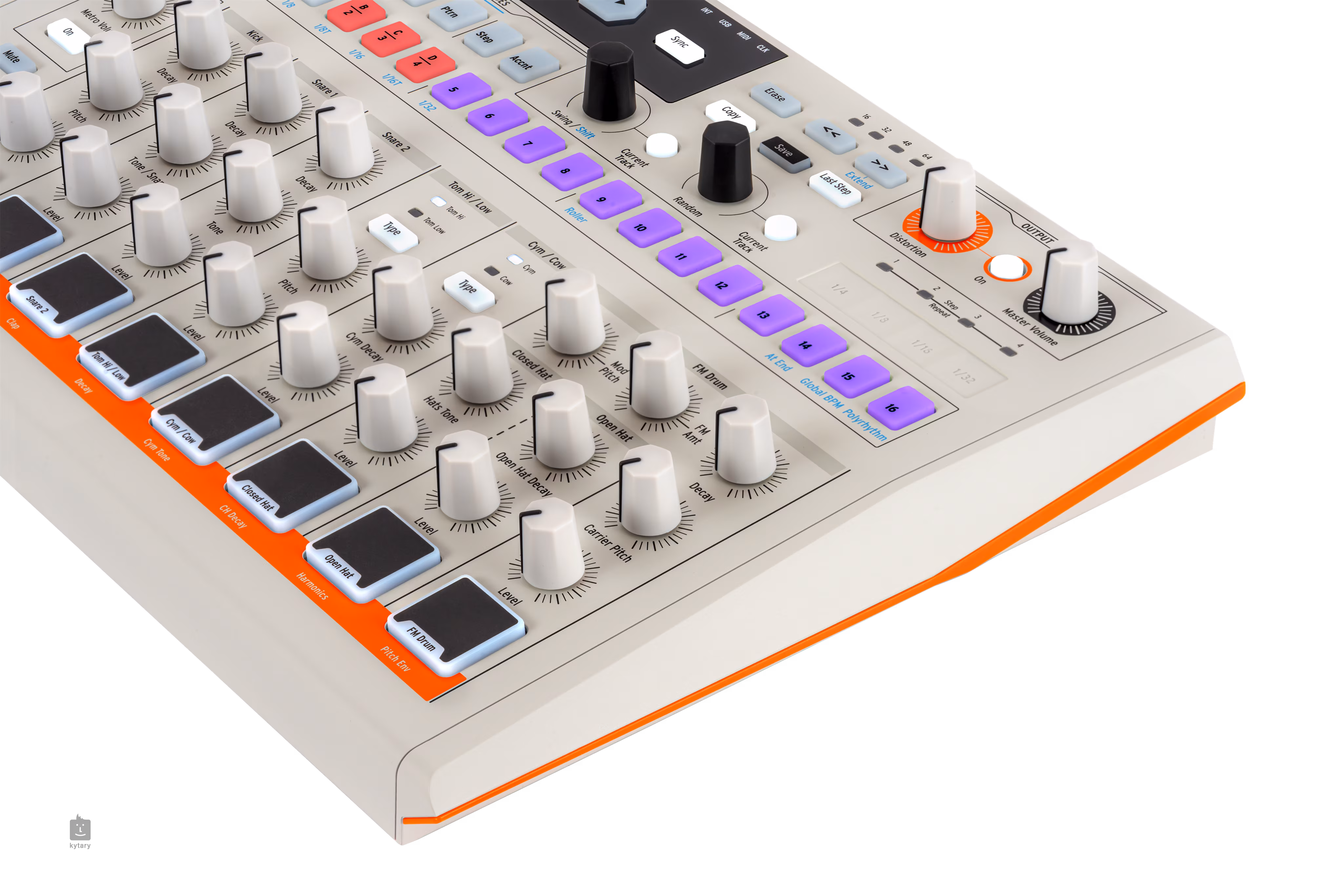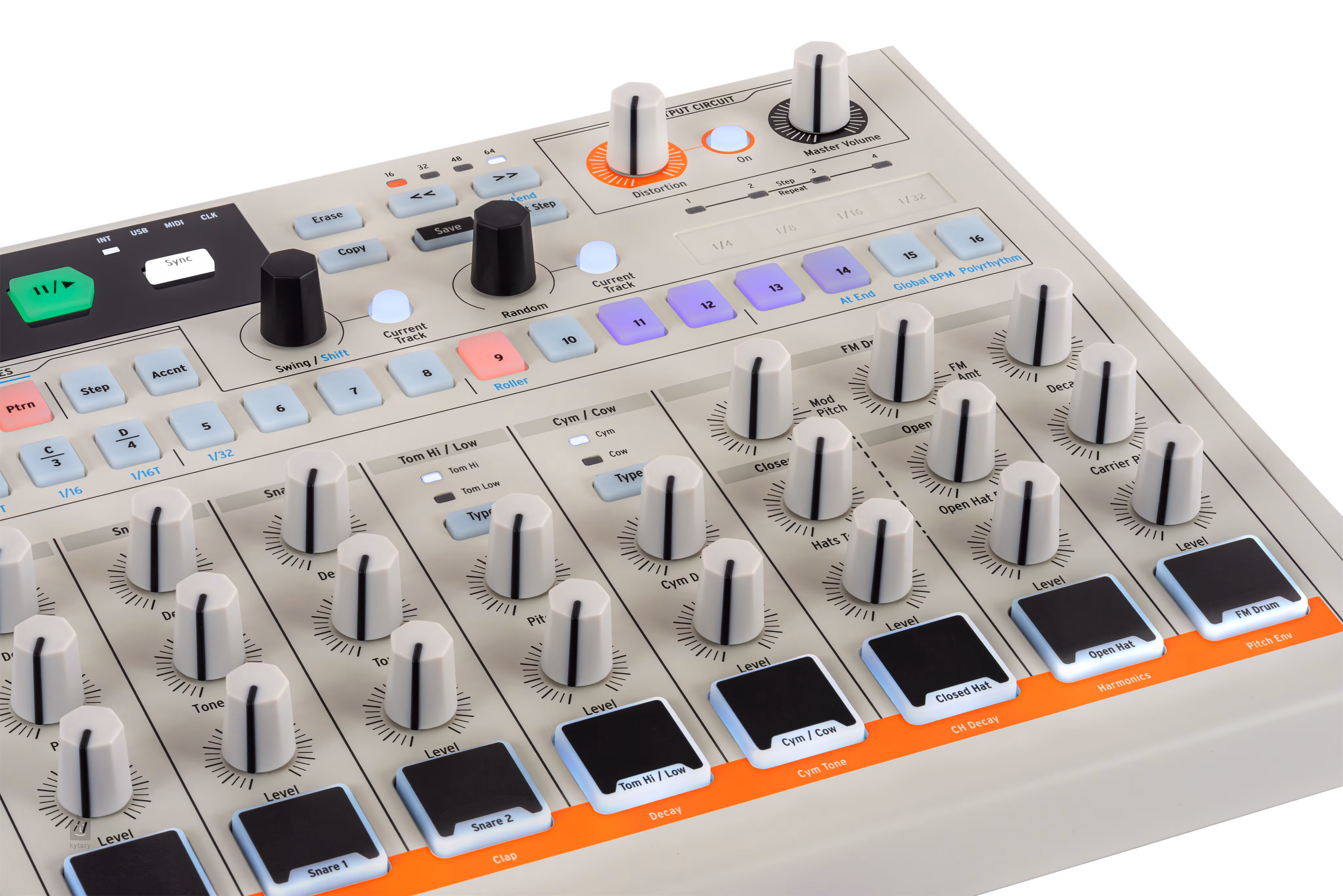 Możesz także użyć ekskluzywnych kolorów dźwięku "Color", aby nadać unikalny efekt każdemu instrumentowi w celu urozmaicenia. Naciśnij przycisk, aby zwiększyć zawartość harmoniczną, dodać drive, snap lub crack, a nawet możesz zautomatyzować zmiany nut, tworząc sekwencję "Color". Jeśli chcesz jeszcze mocniej naciskać na perkusję, użyj wbudowanego zniekształcenia na wyjściu, aby uzyskać odrobinę chrupania zoptymalizowanego pod kątem perkusji.