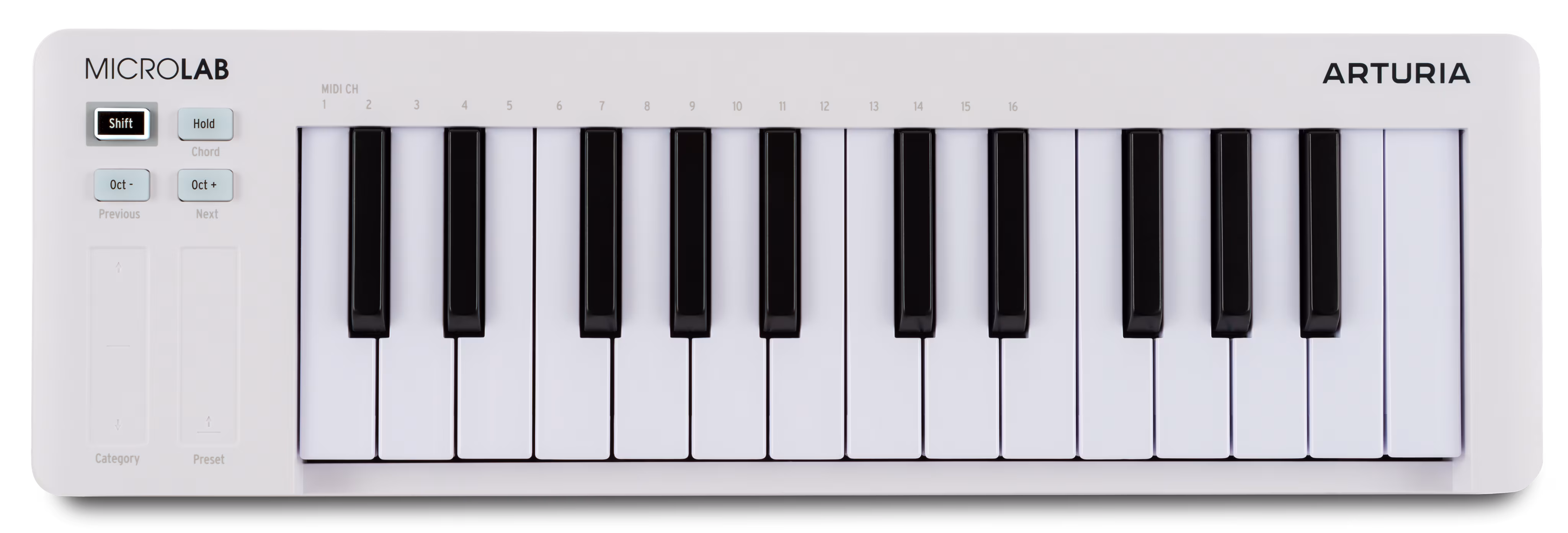 Arturia MicroLab mk3 to ultra-kompaktowy kontroler MIDI, który łączy w sobie jakość, mobilność i prostotę w jednym eleganckim opakowaniu. Jest przeznaczony dla twórców w małych studiach, w podróży i początkujących producentów poszukujących niezawodnego instrumentu z intuicyjnymi elementami sterującymi i profesjonalnym wyczuciem.