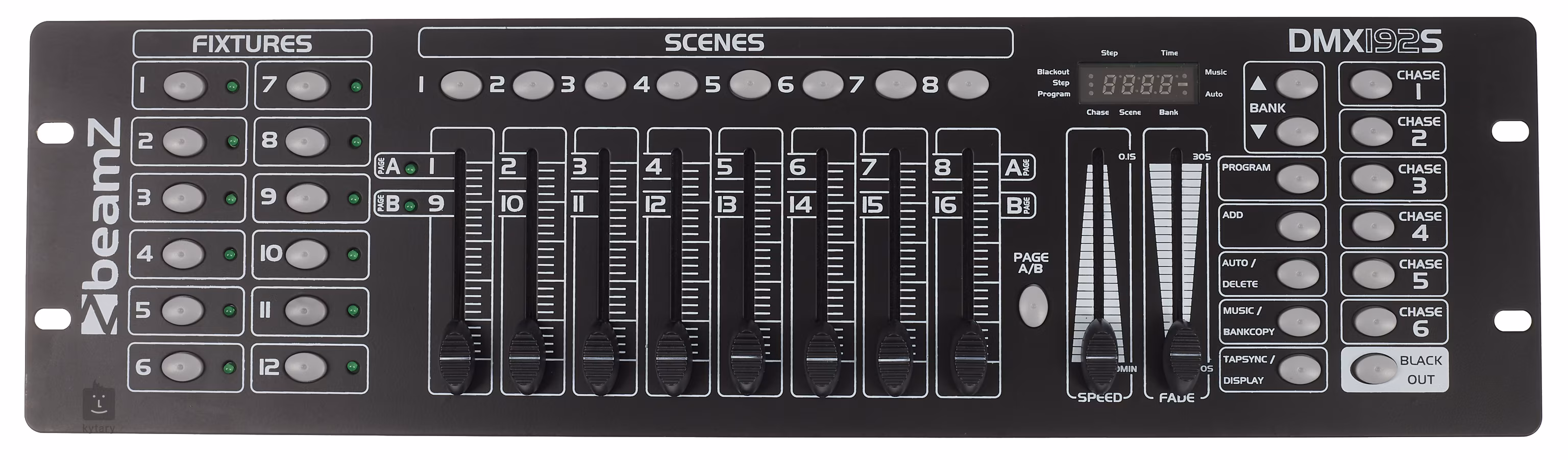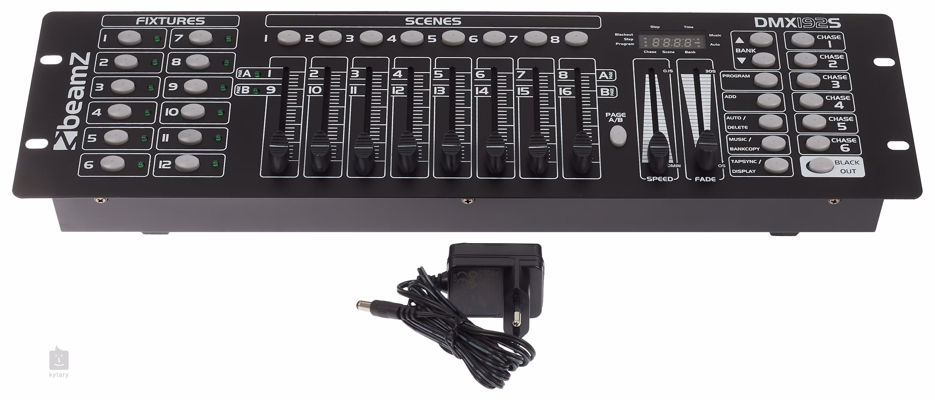 DMX-192S od BeamZ to profesjonalny kontroler DMX, który oferuje szczęśliwy środek między rozbudowanymi opcjami sterowania a kompaktowymi rozmiarami. Jest to kontroler przeznaczony do montażu w szafach rack 19". Urządzenie pozwala na sterowanie 12 urządzeniami i kontrolowanie do 16 kanałów dla każdego urządzenia. Łącznie może obsługiwać 192 kanały. Ponadto pozwala zaprogramować do 240 scen i tworzyć z nich sekwencje lub chase'y. Dostępnych jest 8 banków pamięci dla scen (każdy może pomieścić 30 scen) i 6 sekwencji (każda sekwencja może pomieścić do 240 kroków).