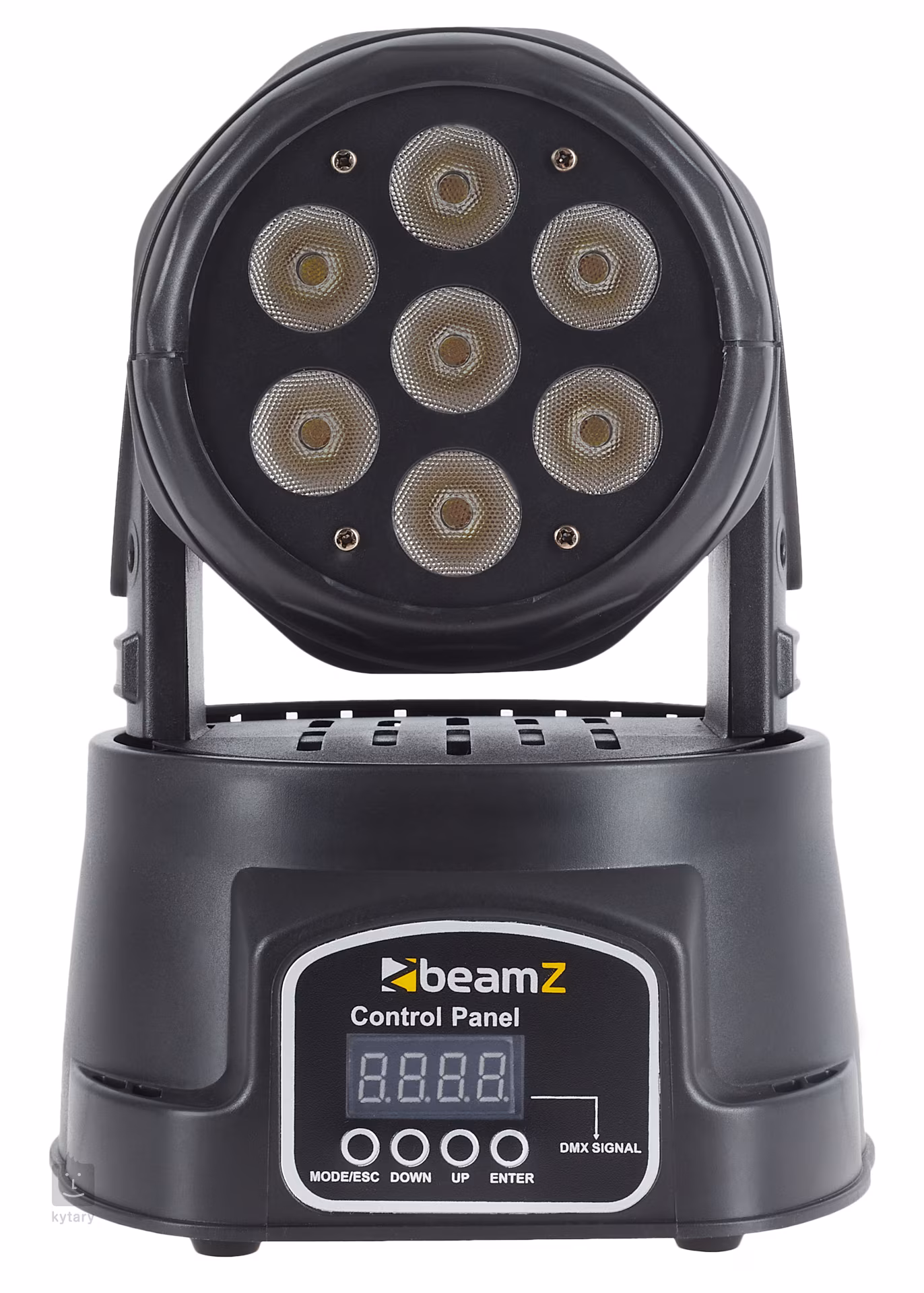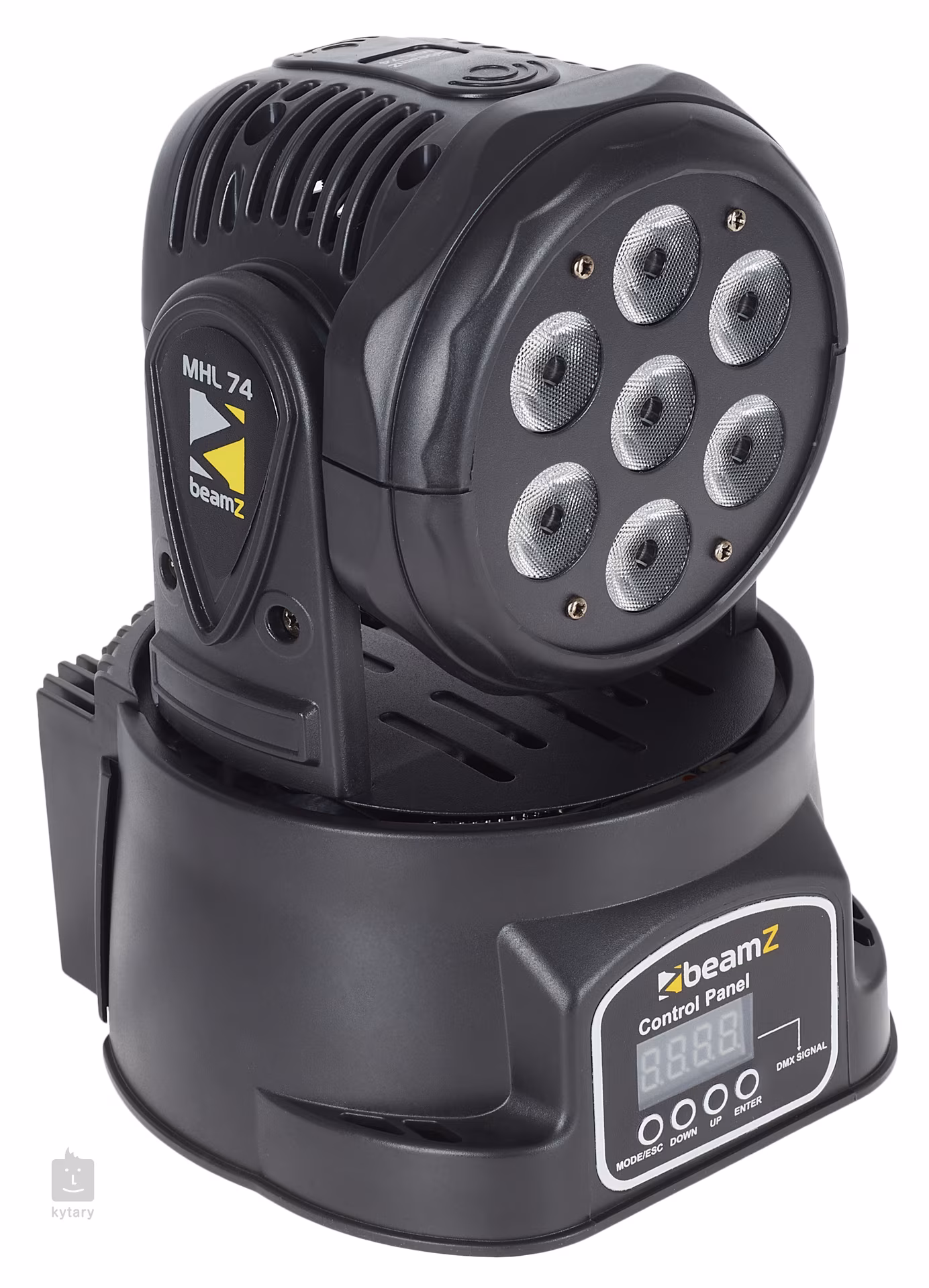 Obrótowa głowica MHL74 firmy BeamZ to kompaktowe i niedrogie urządzenie oświetleniowe, które dzięki niewielkim rozmiarom i niskiej wadze (175 x 175 x 240 mm, 3,4 kg) nadaje się dla podróżujących DJ-ów, zespołów muzycznych, barów i małych klubów. Posiada siedem 10-watowych diod LED RGBW o długiej żywotności i kącie rozsyłu 20° dla rozproszonego oświetlenia wash. Do tworzenia kolorowych efektów świetlnych służy mieszanie kolorów RGBW, które pozwala uzyskać szeroką paletę barw. Dostępny jest również liniowy ściemniacz światła 0–100% oraz efekt stroboskopowy z regulowaną prędkością. Oczywistością jest funkcja Pan (540°) i Tilt (180°). Do sterowania służy standardowy protokół DMX-512 z dwoma trybami kanałowymi (7, 12), automatycznymi programami, trybem Stand Alone lub trybem Master/Slave. Dostępny jest również wyświetlacz LED do ręcznej regulacji. Obrotowa głowica jest wyposażona w 3-pinowe złącza DMX (In/Out) i złącze zasilające IEC.