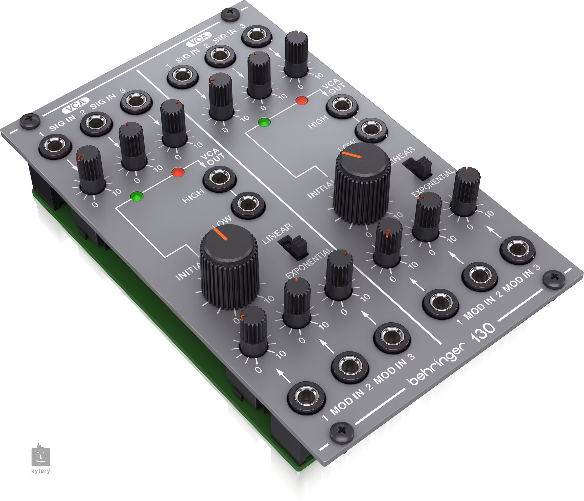 130 Dual VCA posiada dwa niezależne wzmacniacze VCA (Voltage Controlled Amplifier) z ręczną regulacją wzmocnienia i dwoma wyjściami audio (niskie/wysokie) ze wskaźnikami sygnału i przesterowania. Każdy VCA oferuje przełącznik liniowy/wykładniczy dla dodatkowej elastyczności oraz 3-kanałowy mikser do niezależnego miksowania sygnałów wejściowych.