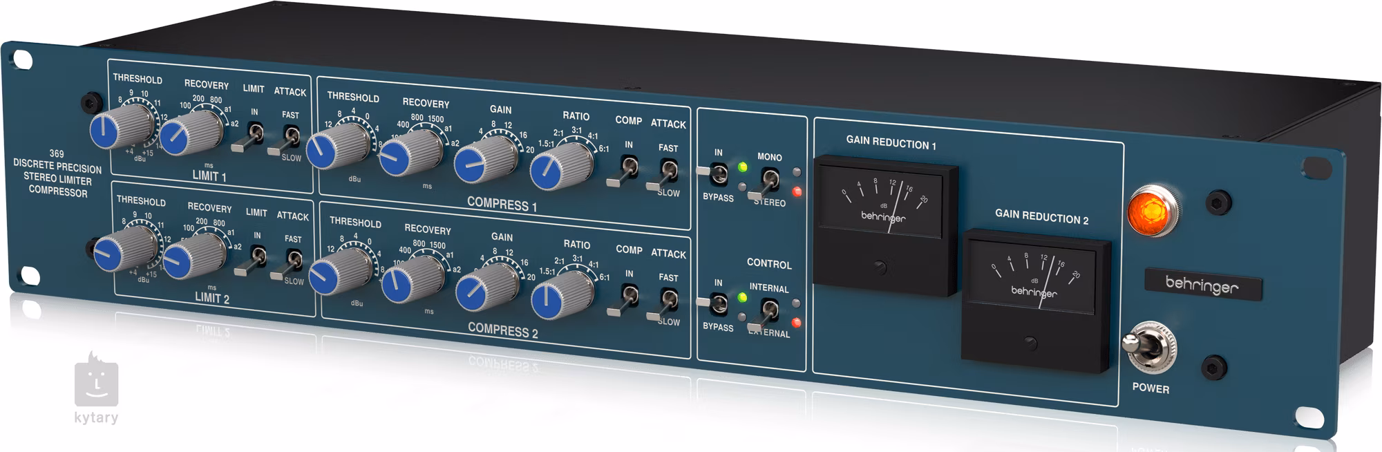 Ponieważ jest to dwukanałowy procesor sygnałowy, 369 można ustawić do pracy w trybie stereo lub mono za pomocą jednego przełącznika. Można również przełączyć każdy z nich w tryb obejścia (bypass) w celu zwiększenia elastyczności. Przełącznik Control umożliwia również przełączanie między wewnętrznym sterowaniem, które pozwala ustawić funkcje Mono/Stereo i Bypass na samym panelu przednim, a zewnętrznym sterowaniem do zdalnego sterowania za pomocą konsoli mikserskiej, takiej jak Behringer WING, lub dowolnego innego niestandardowego urządzenia zdalnego sterowania podłączonego do gniazda Tandem Control Voltage na panelu tylnym.