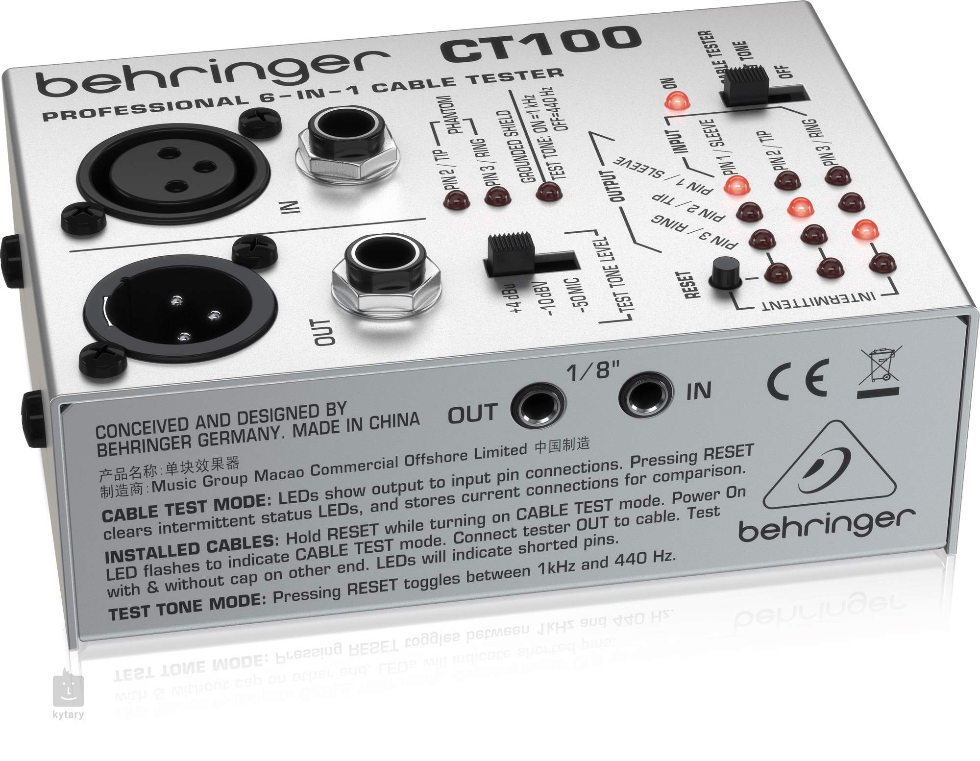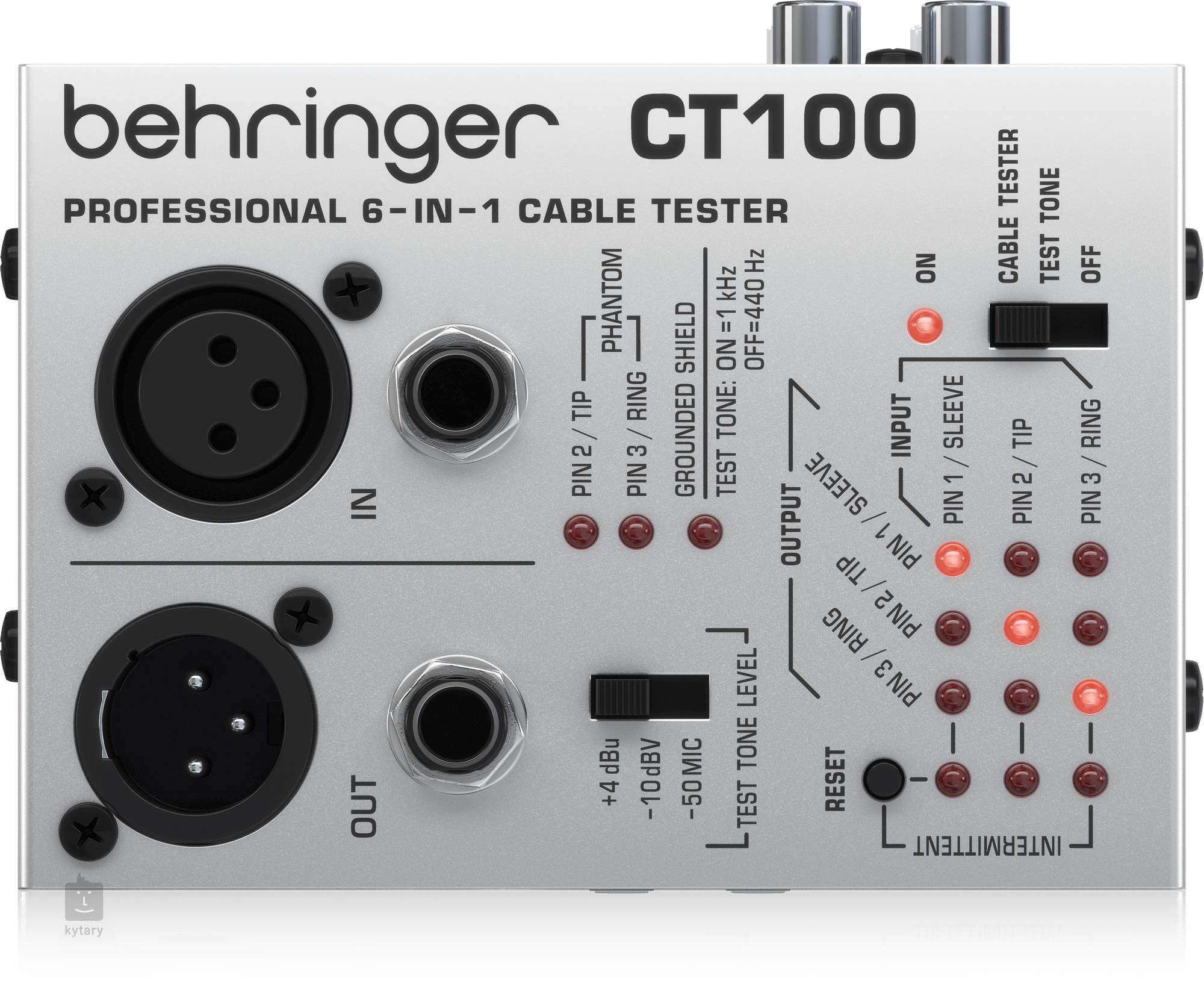 Behringer CT100 to tester kabli 6 w 1, który jest kompatybilny z prawie wszystkimi kablami używanymi w studiu lub na koncertach, tj. XLR, mono Jack 6,3 mm, TRS, telefoniczny Jack 3,5 mm, TT, RCA, a nawet MIDI. Test okablowania, test zainstalowanego okablowania i Tone. Diody LED wskazują, które wejścia i wyjścia są podłączone, a także wskaźniki LED ekranowania i zasilania phantom. Do zasilania urządzenia wymagane są dwie baterie AA.