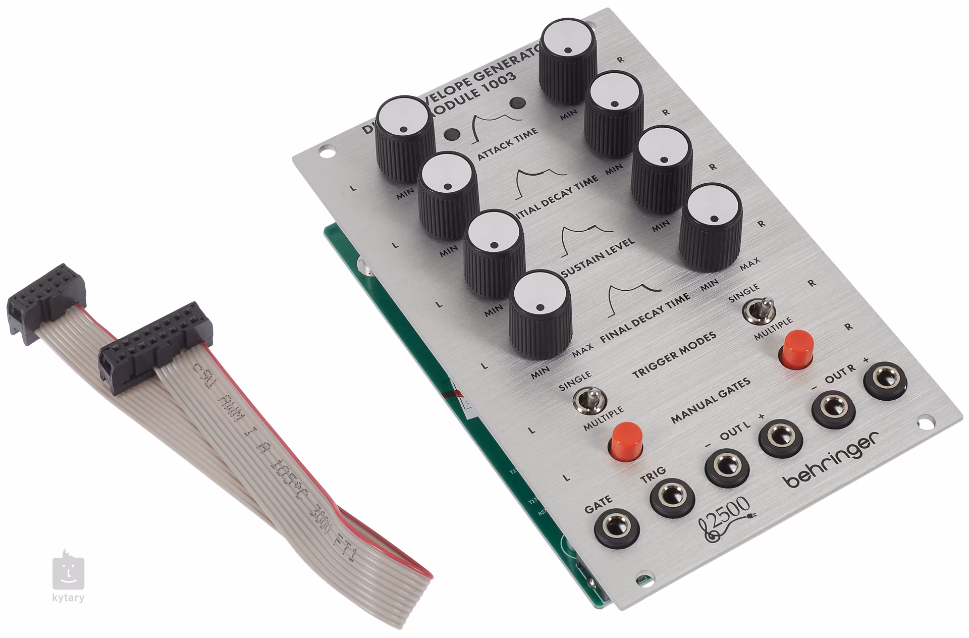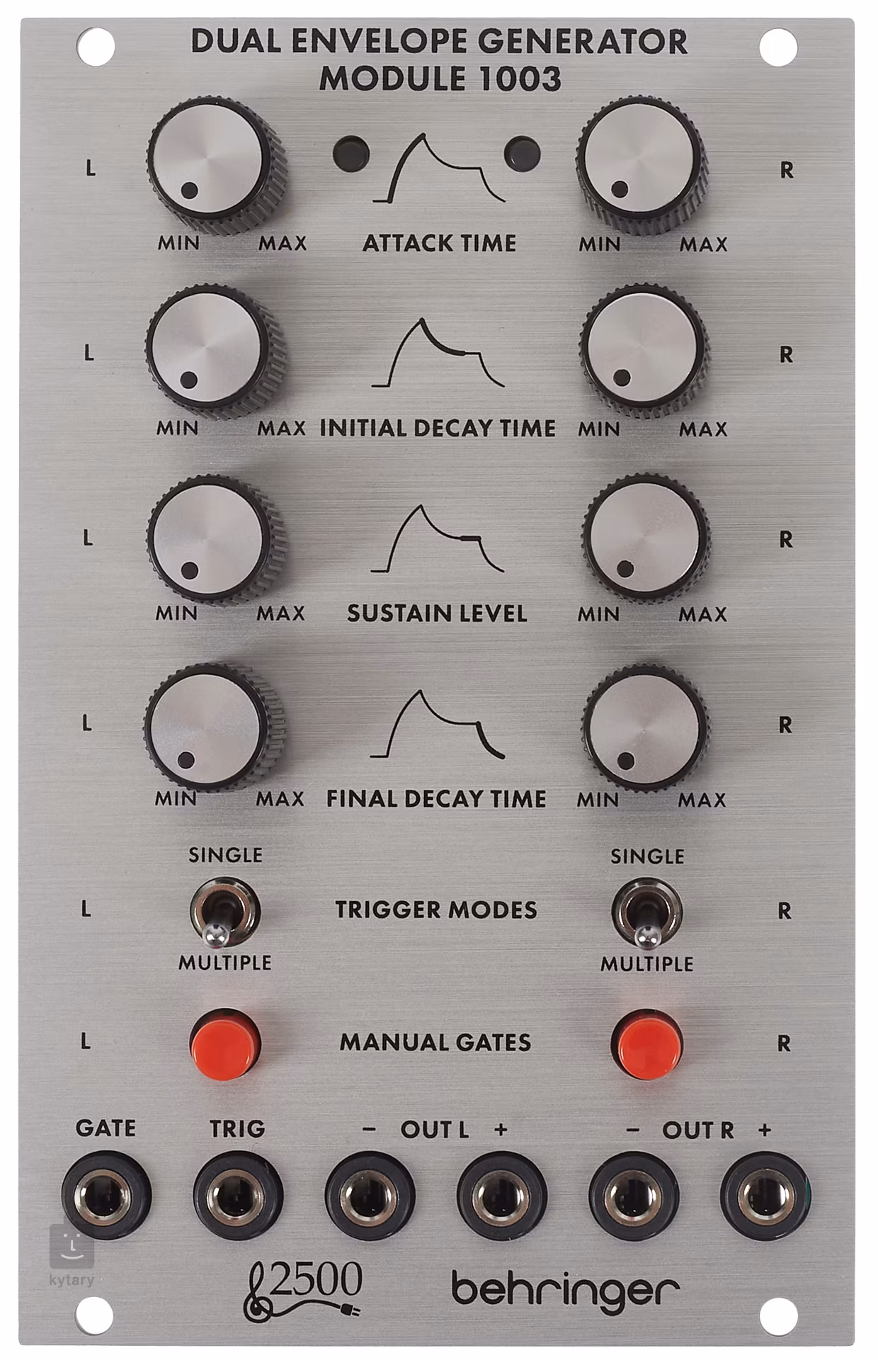 Moduł Behringer 1003 DUAL ENVELOPE GENERATOR MOD ULE zawiera 2 identyczne generatory obwiedni do tworzenia sygnałów sterujących. Attack, Initial Decay, Sustain, Final Decay. Obwiednia jest wyzwalana przez sygnały Gate i Trigger. Moduł można przełączać między 2 trybami pracy. Tryb pojedynczego wyzwalania wykorzystuje tylko sygnał bramki do sterowania obwiednią. Tryb wielokrotnego wyzwalania wykorzystuje dodatni impuls wyzwalający do ponownego wyzwolenia obwiedni, gdy obecny jest sygnał bramki. Ręczne wyzwalanie bramki za pomocą przycisku na panelu przednim ze wskaźnikiem LED sygnału bramki.