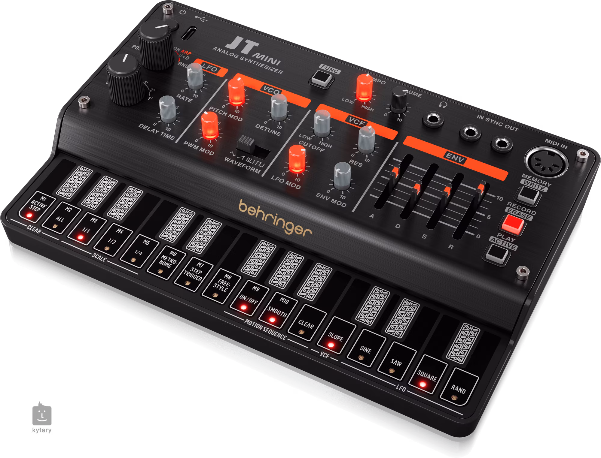 Sekcja VCF posiada kontrolę odcięcia i rezonansu. Istnieje również możliwość dodania modulacji LFO i Envelope, które można kontrolować za pomocą specjalnych suwaków ADSR. Dzięki 27 klawiszom dotykowym, JT MINI pozwala również na bardzo przyzwoitą grywalność w przeciwieństwie do jego niewielkich rozmiarów, dzięki klasycznemu złączu MIDI można również podłączyć pełną klawiaturę, na przykład do występów na żywo lub nagrywania. W połączeniu z łatwym do zaprogramowania 16-krokowym sekwencerem otrzymujesz wszechstronny, potężny i kompaktowy instrument do kształtowania dźwięku, który z łatwością znajdzie miejsce w Twoim składzie.