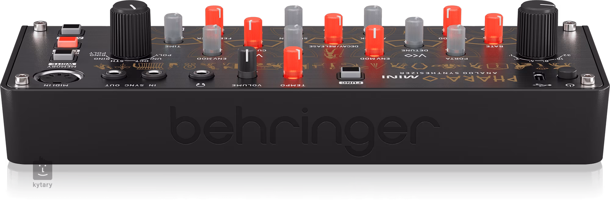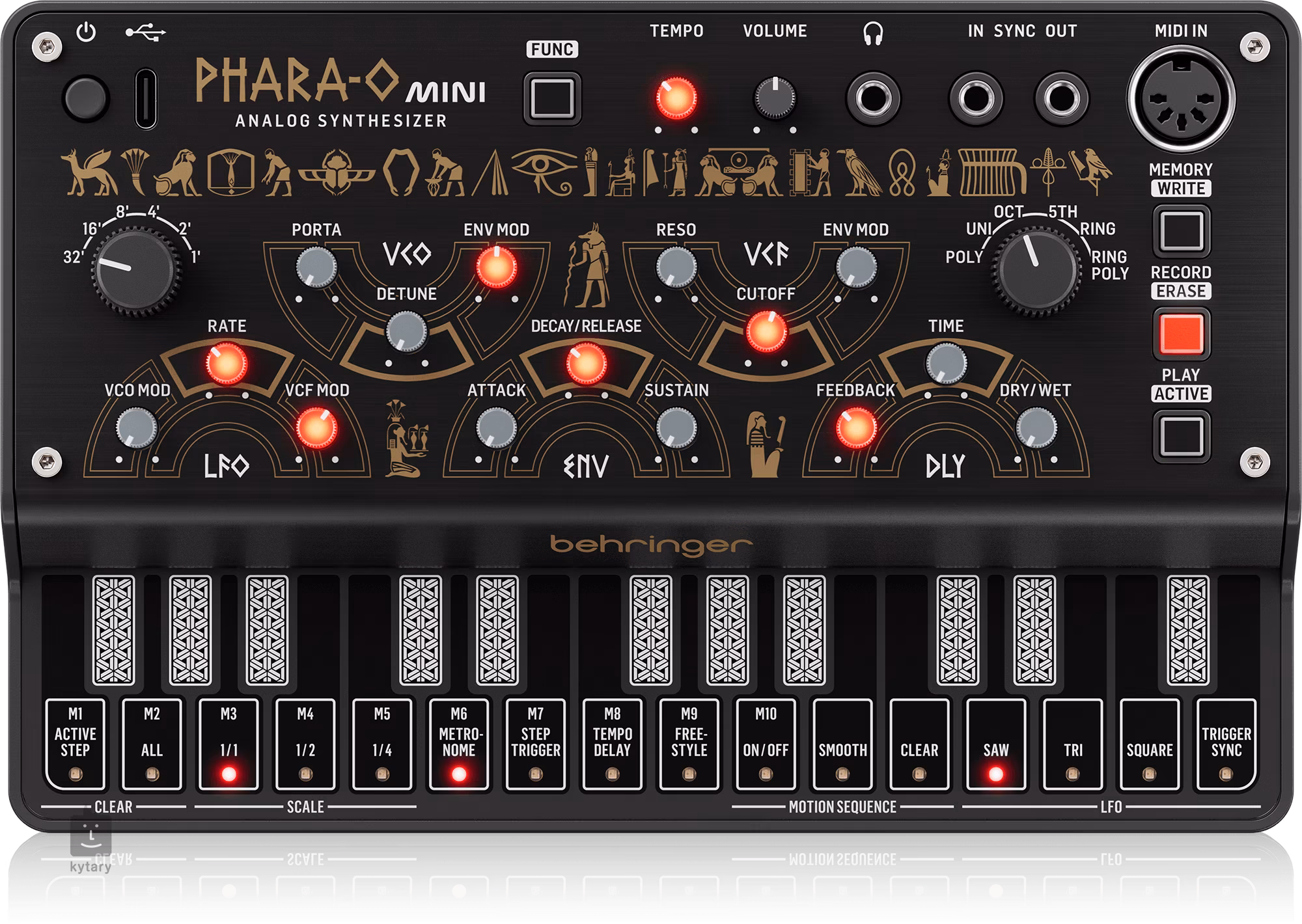 Behringer Phara-O Mini to analogowy syntezator polifoniczny z 3 VCO, klasycznym VCF, modulatorem kołowym, 16-stopniowym sekwencerem krokowym i efektem opóźnienia.