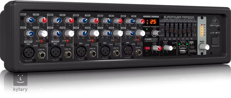 Behriger PMP550M to mikser z wzmacniaczem, pięcioma kanałami, procesorem efektów Klark Teknik, wykrywaniem sprzężenia zwrotnego i możliwością integracji z systemem bezprzewodowym Behringer. Wzmacniacz klasy D oferuje moc 500 W, mikser jest bardzo kompaktowy i można go zamontować w szafie rack.