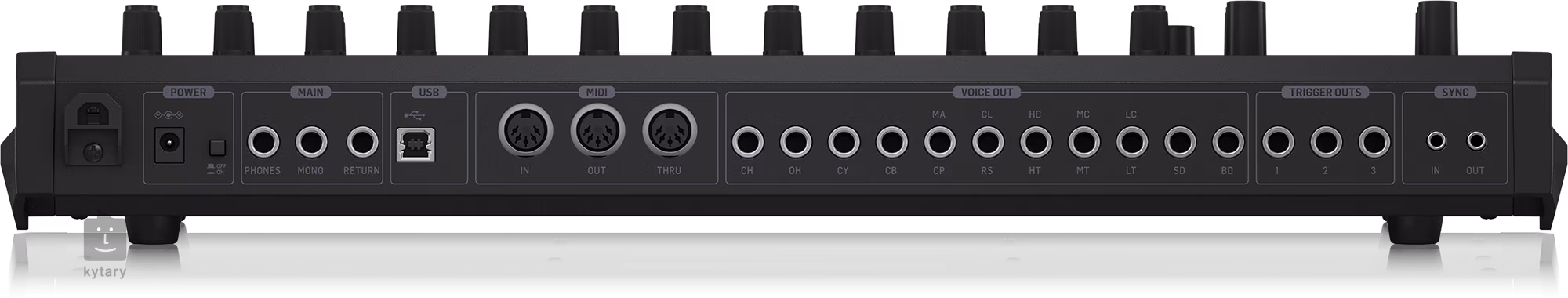 1x Jack 6.3 mm (Main), 1x Jack 6.3 mm (Phones), 11x Jack 6.3 mm (Individiual outs), 3x Jack 6.3 mm (Trigger), Jack 3.5 mm (Sync), MIDI 5-pin DIN