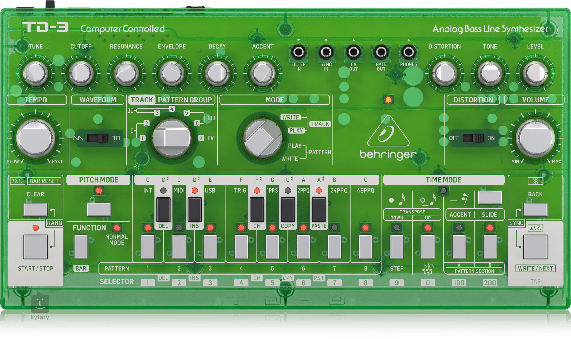 Jak prawdziwy analogowy syntezator, zawiera niezliczoną ilość filtrów i efektów, wszystkie schludnie rozmieszczone na obszernym panelu kontrolnym. Znajdziesz tu filtr VCO z dwoma przebiegami i oktawerem, bardzo elastyczny 24 dB VCF, VCA i 16-krokowy sekwencer z siedmioma ścieżkami, z których każda może zawierać do 250 patternów. Możesz również użyć szerokiego arpeggiatora do uzyskania wspaniałych efektów dźwiękowych lub powtórzeń, a na koniec efekt Distortion inspirowany legendarnym BOSS DS-1. Masz wtedy do dyspozycji 11 diod LED i 28 przycisków/pokręteł, aby łatwo ustawić pożądane brzmienie. Dzięki łańcuchowi wielogłosowemu możesz połączyć do szesnastu syntezatorów, aby uzyskać wyjątkową polifonię.