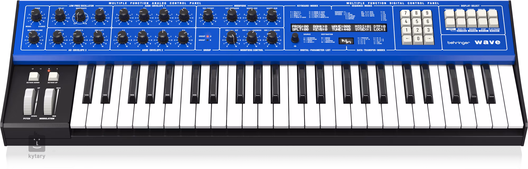 Behringer Wave to 8-głosowy hybrydowy syntezator multitimbral z generatorami Wavetable, analogowymi VCF i VCA, LFO, 3 obwiedniami, arpeggiatorem i sekwencerem.