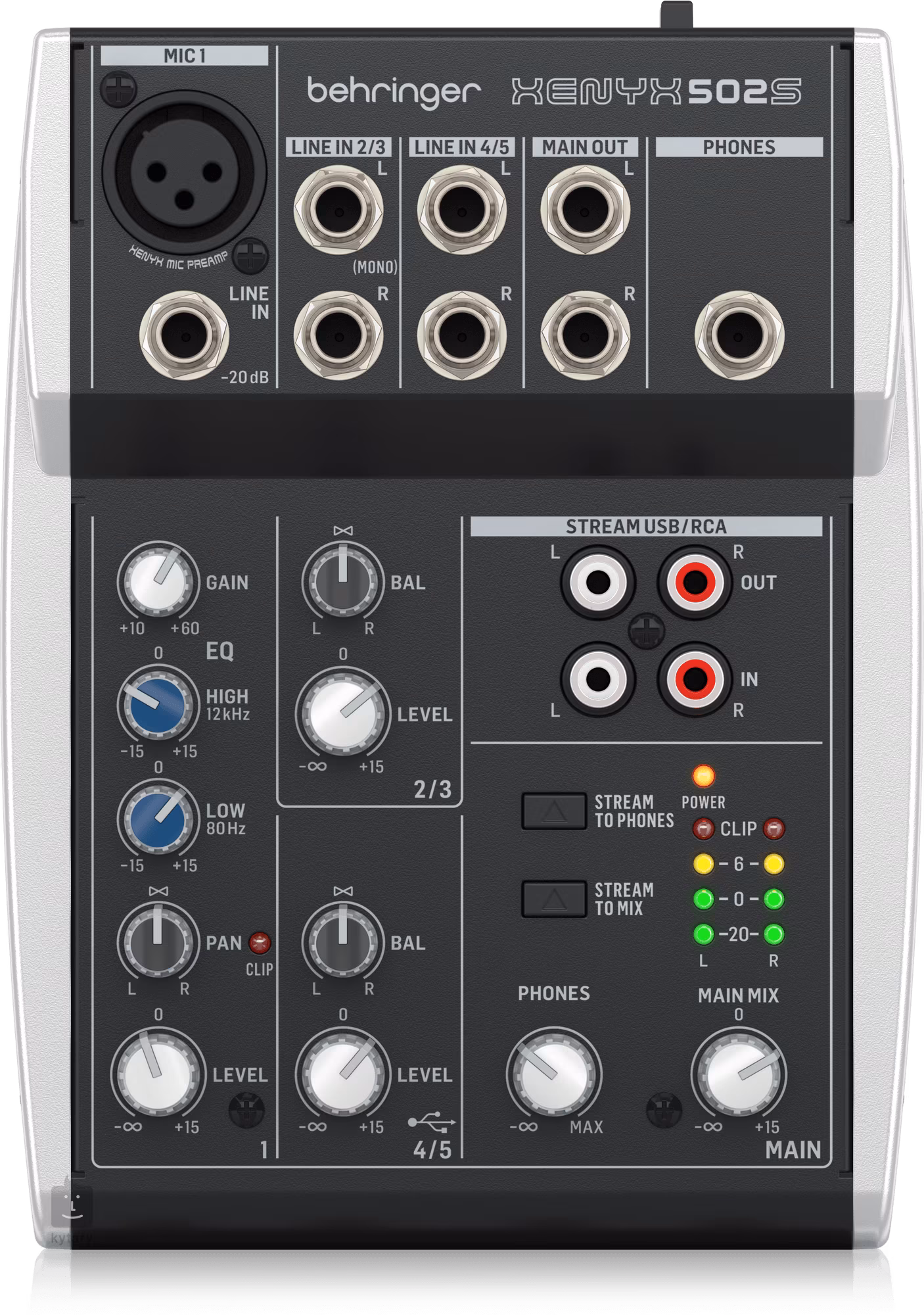 Behringer XENYX 502S to analogowa konsola mikserska odpowiednia do streamingu, podcastingu lub nagrywania. Posiada jeden kanał mono i dwa kanały stereo, ciepły i muzykalny dźwięk przedwzmacniacza mikrofonowego XENYX, stereofoniczny interfejs audio USB do podłączenia do komputera i urządzeń mobilnych, dwupasmowy korektor, bezpośrednie miksowanie dźwięków z komputera / gier z wyjścia strumieniowego stereo RCA, wejście stereo RCA przypisywane do głównego miksu / wyjścia lub wyjścia słuchawkowego oraz kanał stereo 4/5 automatycznie przełączający się między wejściem TRS a odtwarzaniem USB