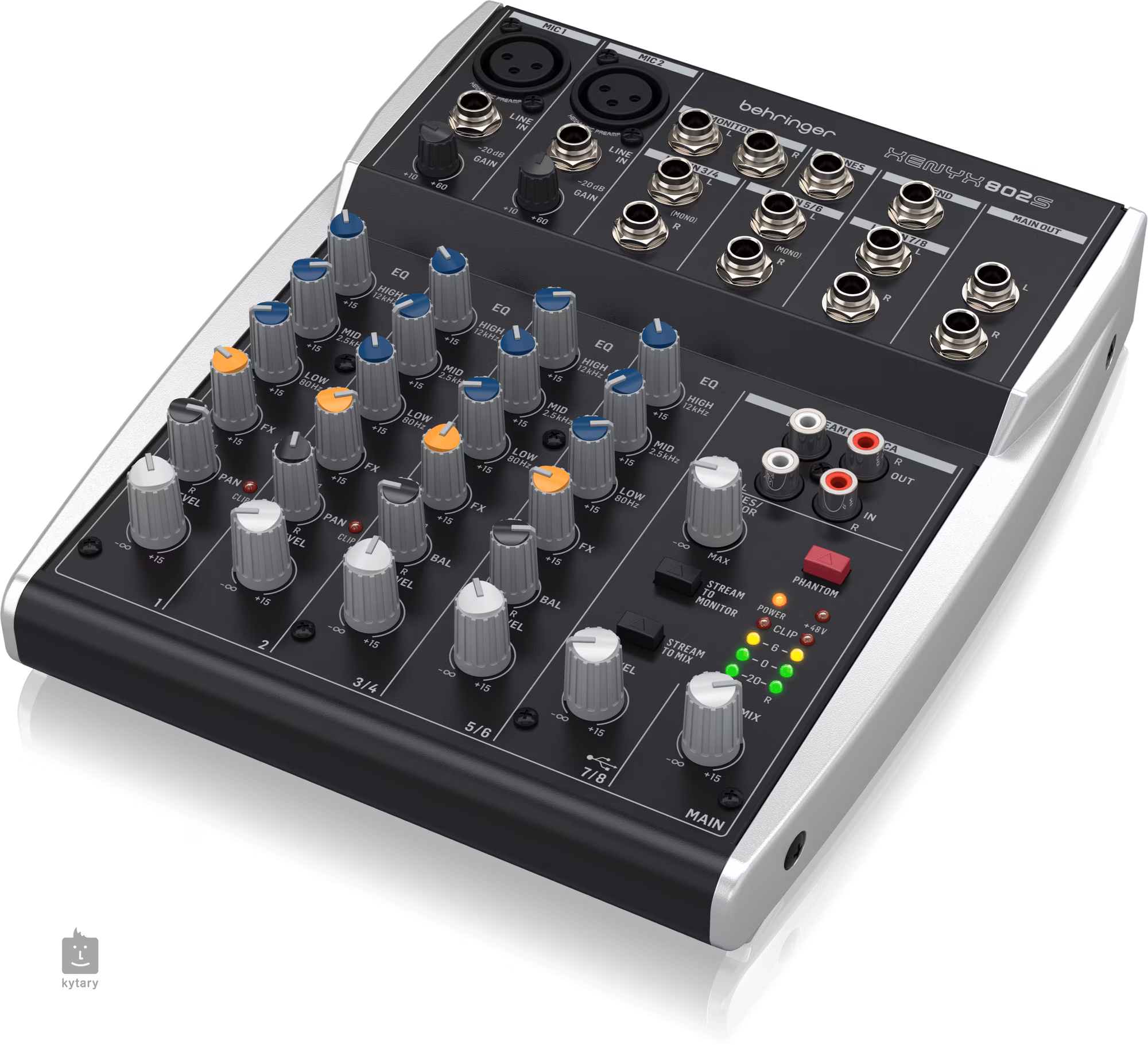 Behringer XENYX 802S to analogowa konsola mikserska odpowiednia do streamingu, podcastingu lub nagrywania. Posiada dwa kanały mono i trzy kanały stereo (dwa z korektorem), ciepły i muzykalny dźwięk przedwzmacniaczy mikrofonowych XENYX, stereofoniczny interfejs audio USB do podłączenia do komputera i urządzeń mobilnych, trzypasmowy korektor, bezpośrednie miksowanie dźwięków z komputera / gier ze stereofonicznego wyjścia strumieniowego RCA, stereofoniczne wejście RCA, które można przypisać do głównego miksu/wyjścia lub wyjść słuchawkowych/monitorowych, stereofoniczny kanał 7/8 automatycznie przełączający się między wejściem TRS i odtwarzaniem USB oraz sterowanie wysyłaniem FX dla zewnętrznych procesorów efektów/monitoringu miksu.