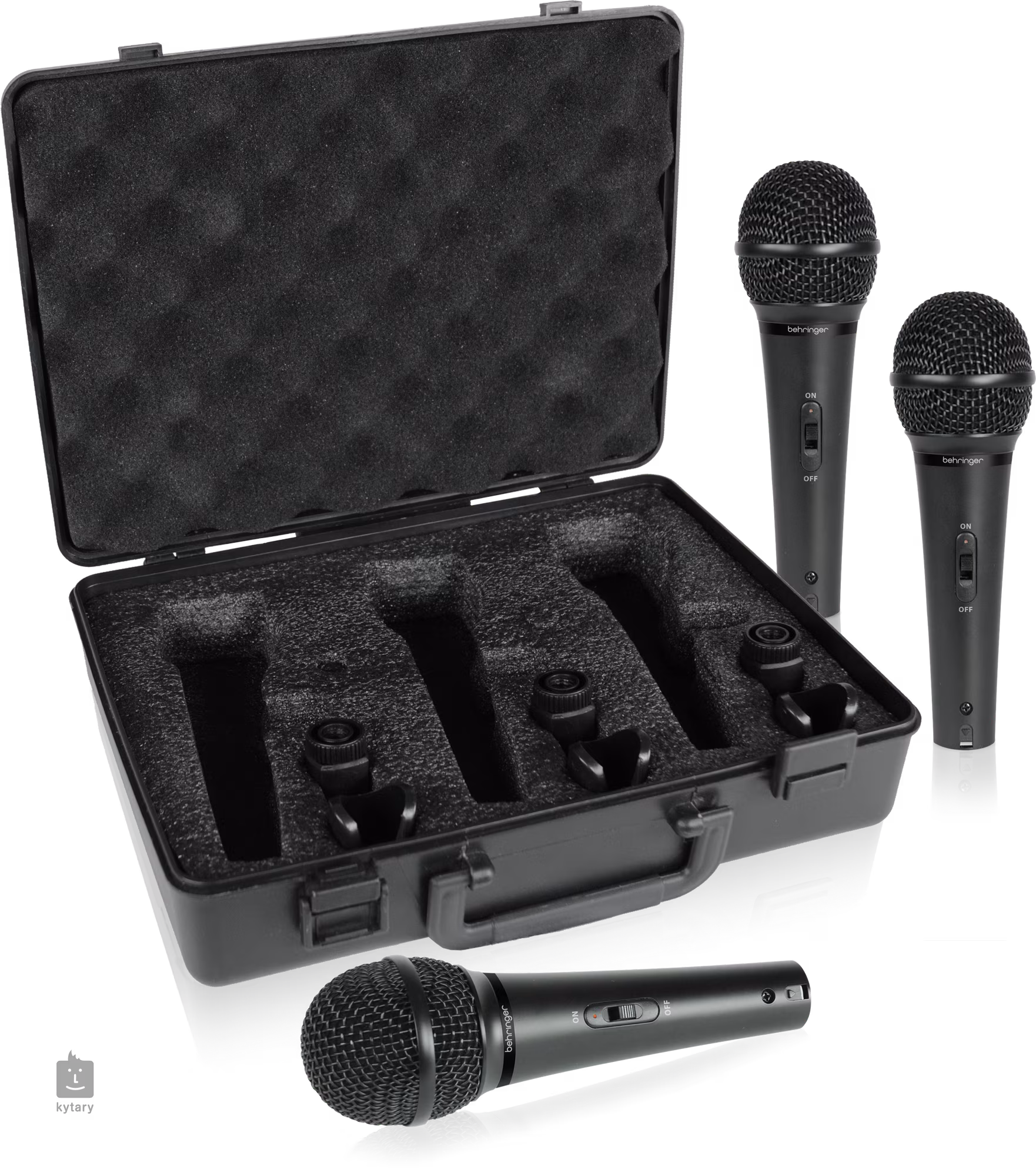 Zestaw trzech niedrogich mikrofonów dynamicznych Behringer XM1800S o superkardioidalnej charakterystyce kierunkowej, odpowiednich do nagłaśniania wokali i instrumentów. Mikrofony dostarczane są w walizce wraz z trzema uchwytami mikrofonowymi.