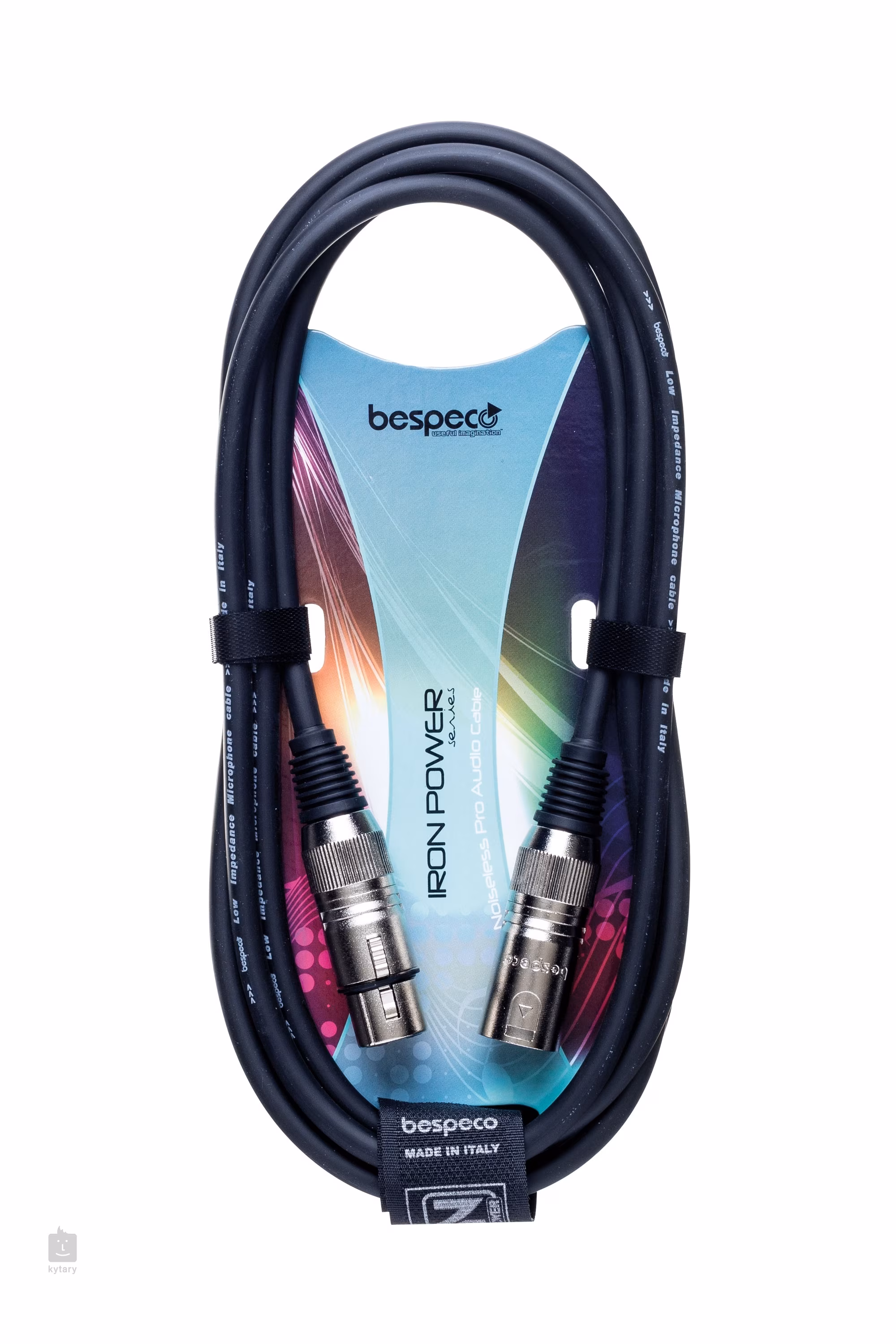 Kabel mikrofonowy Bespeco z serii Iron. Wnętrze kabla wykonane jest w 98% z miedzi OFC, złącza z wytrzymałej stali, a powierzchnia z bardzo wytrzymałego PVC dla maksymalnej elastyczności i długiej żywotności. Do zestawu dołączona jest para pasków na rzepy ułatwiających transport.