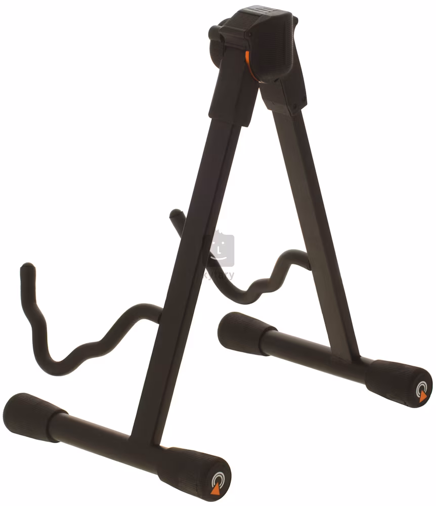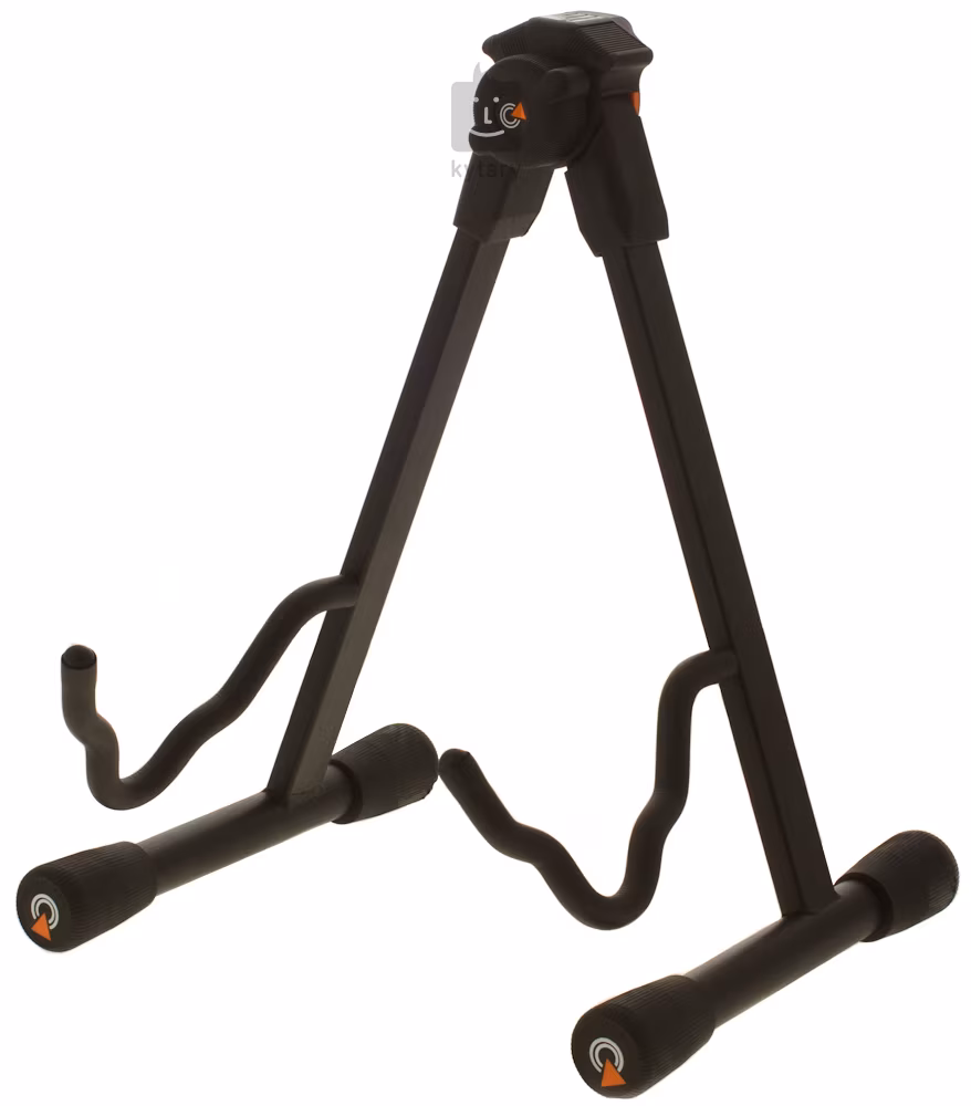 Profesjonalny metalowy statyw z nylonowym przegubem do gitary akustycznej i elektrycznej. Nakładki na nogi są asymetryczne, wystarczy je obrócić, aby uzyskać doskonałą stabilność stojaka na nierównym podłożu. Nad "kostką" znajdują się wycięcia do przechowywania kostek, aby były zawsze pod ręką. W zestawie znajdują się trzy kostki.