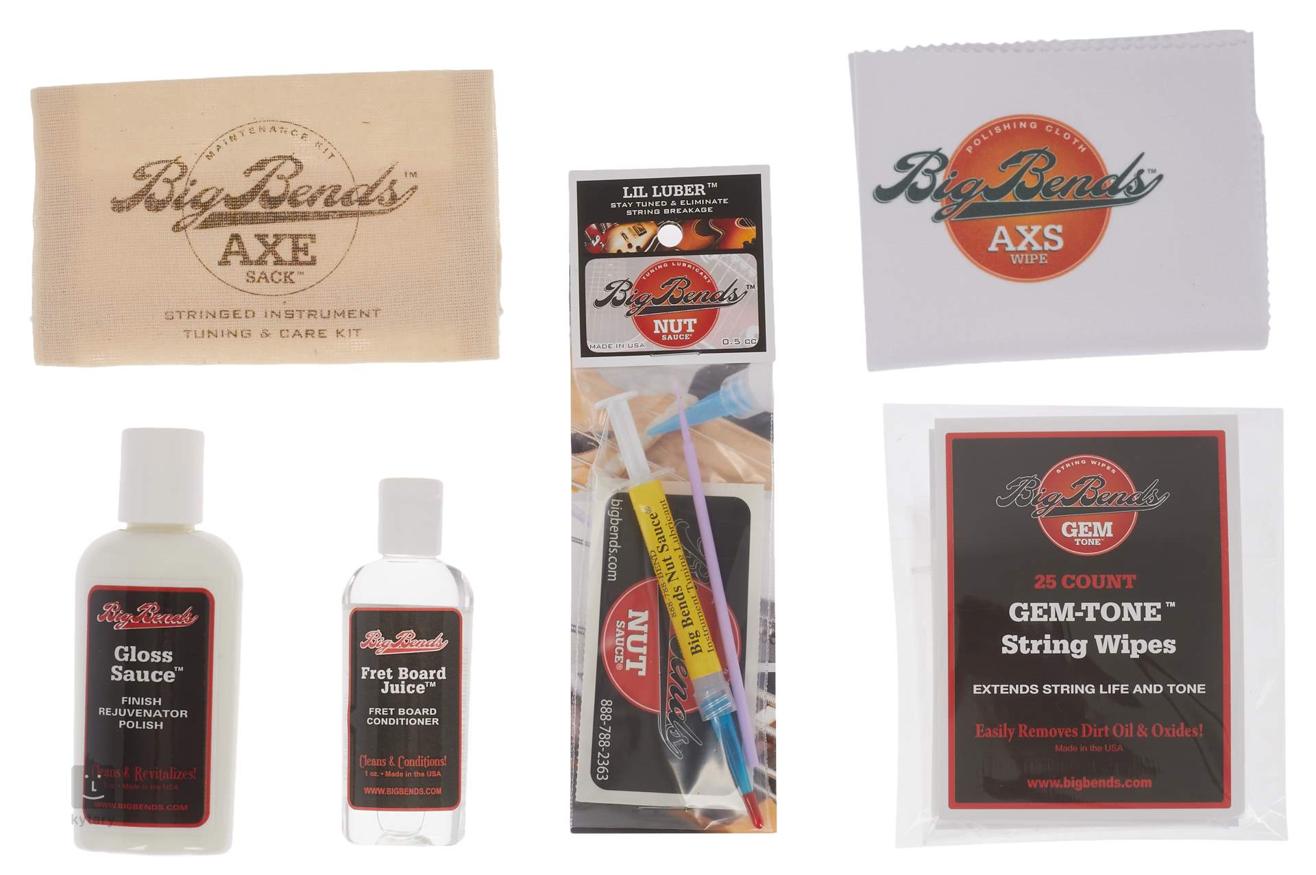 Lista konkretnych produktów zawartych w zestawie - 25x String Wipe, AXS Microfiber Wipe, Gloss Sauce Polish, Fret Board Juice Conditioner, Lil Luber, Stay in Tune Sticker, AXE Sack.