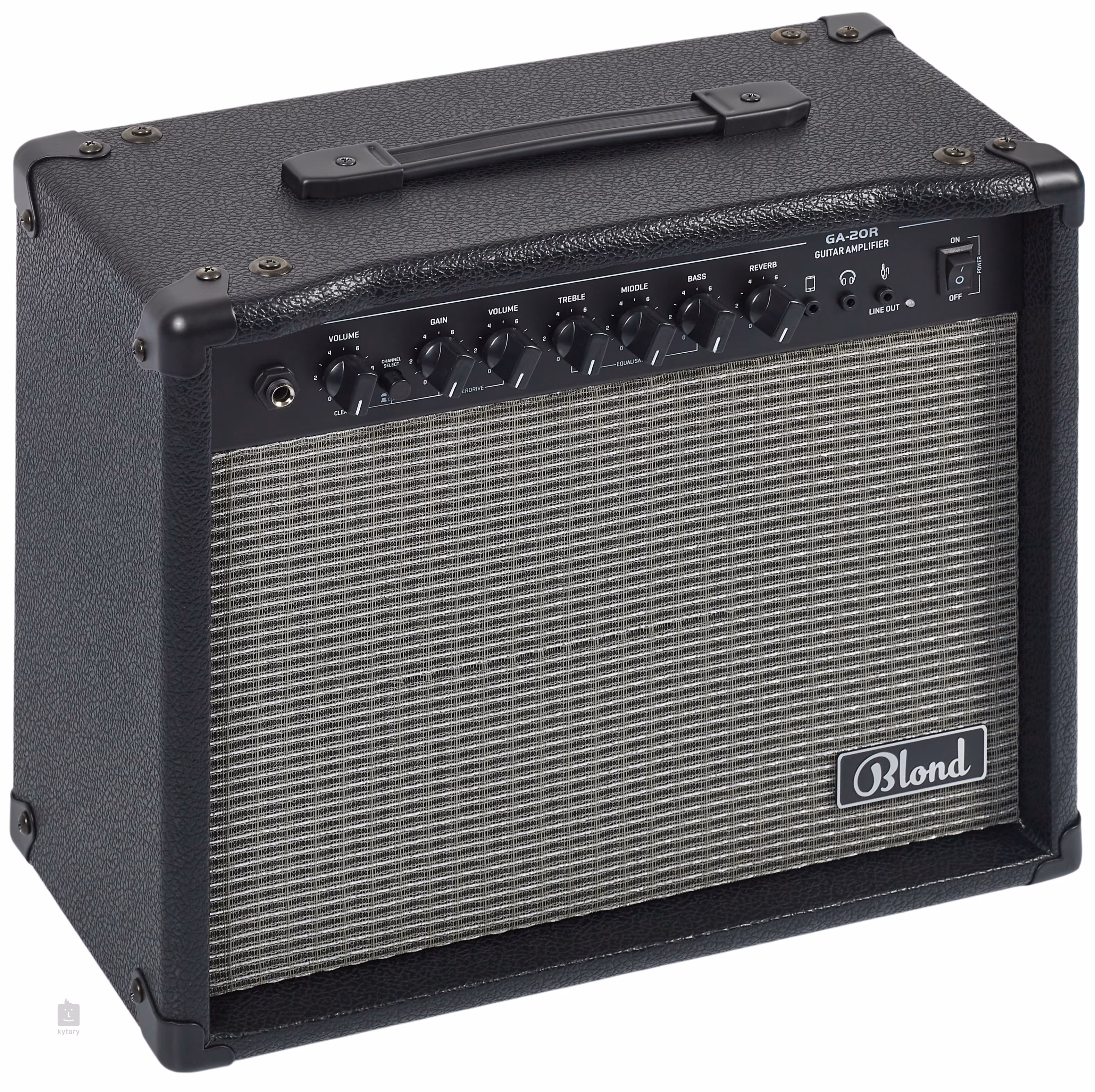 Blond GA-20R oferuje dwa przełączalne kanały (czysty i overdrive) z oddzielnymi regulatorami głośności, regulator Gain kanału overdrive, którym można określić stopień przesterowania overdrive, trzypasmowy korektor do dostrojenia charakteru dźwięku/częstotliwości, wbudowany efekt pogłosu, wyjście słuchawkowe, wejście aux in do odtwarzania podkładów audio oraz wyjście liniowe.
