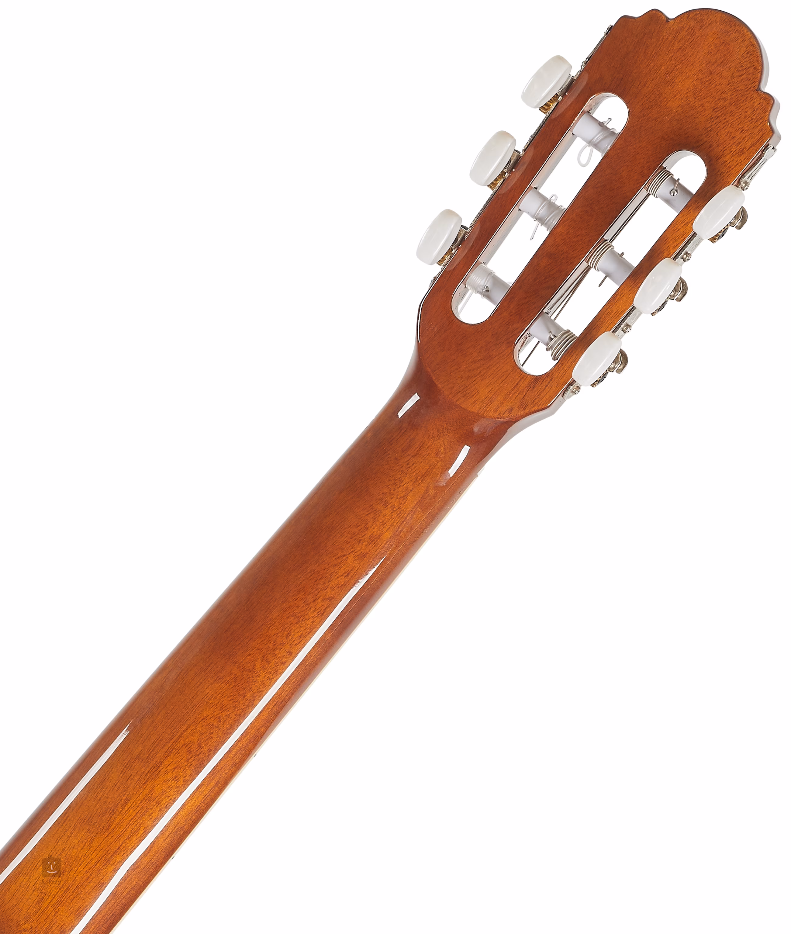 Gitary klasyczne marki Blond to niedrogie instrumenty odpowiednie dla początkujących muzyków. Dzięki nim opanują oni podstawowe techniki i umiejętności, a ponadto za cenę, która nie obciąży budżetu rodzinnego. Klasyczna gitara dla dzieci Blond OC-34 BB w rozmiarze 3/4 ma korpus wykonany z warstwowego świerku i lipy, gryf z drewna okoumé oraz podstrunnicę i mostek z nowoczesnego materiału kompozytowego. Struny są przymocowane przez plastikowy zerowy próg do klasycznych chromowanych mechanizmów z białymi kołkami. Stylowe wykończenie podkreśla nałożony błyszczący lakier, wykończenie Blue Burst przedniej płyty oraz tradycyjne elementy w postaci ozdobnej rozety i plastikowej obręczy (ABS).