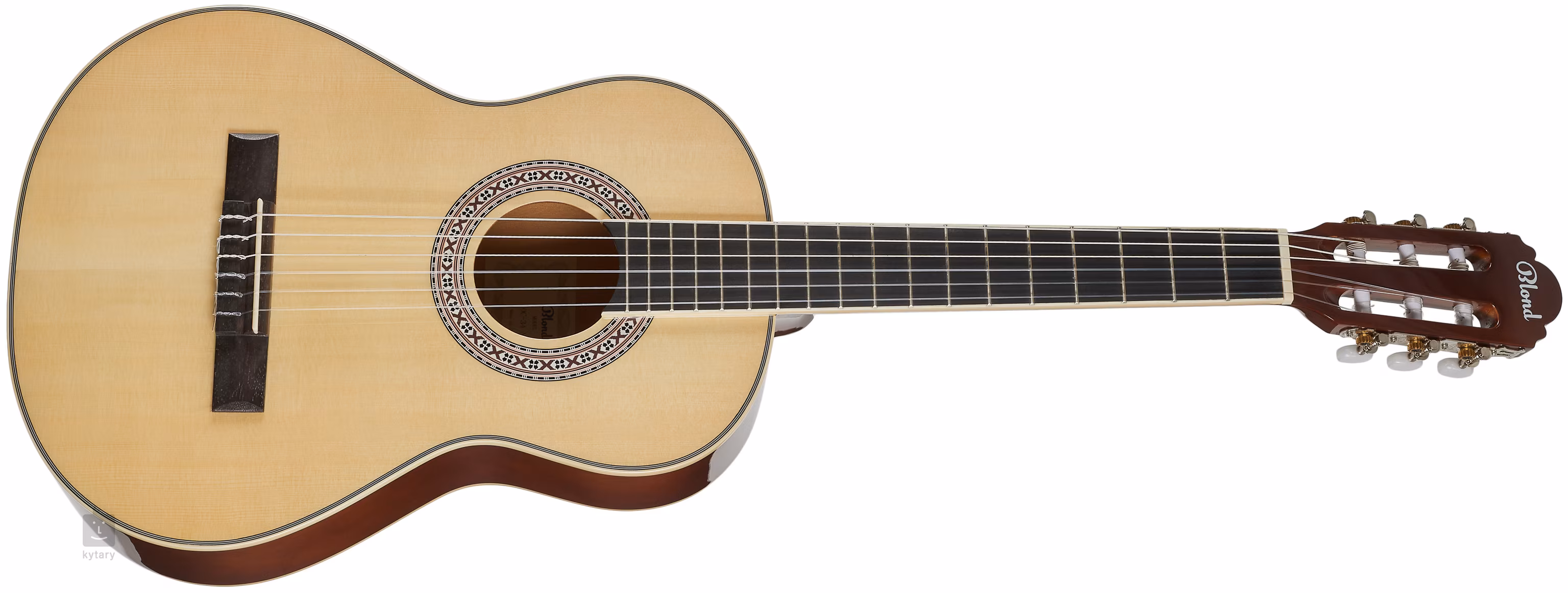 Dziecięca gitara klasyczna Blond OC-34 NAT w rozmiarze 3/4 posiada korpus wykonany z laminowanego świerku i lipy, szyjkę z drewna okoumé oraz podstrunnicę i główkę z nowoczesnego materiału kompozytowego. Struny są zamontowane w klasycznych chromowanych mechanizmach z białymi kołkami na plastikowej podstrunnicy. Stylowe wykończenie podkreśla zastosowany błyszczący lakier oraz tradycyjne elementy w postaci ozdobnych rozet i plastikowych wykończeń (ABS).