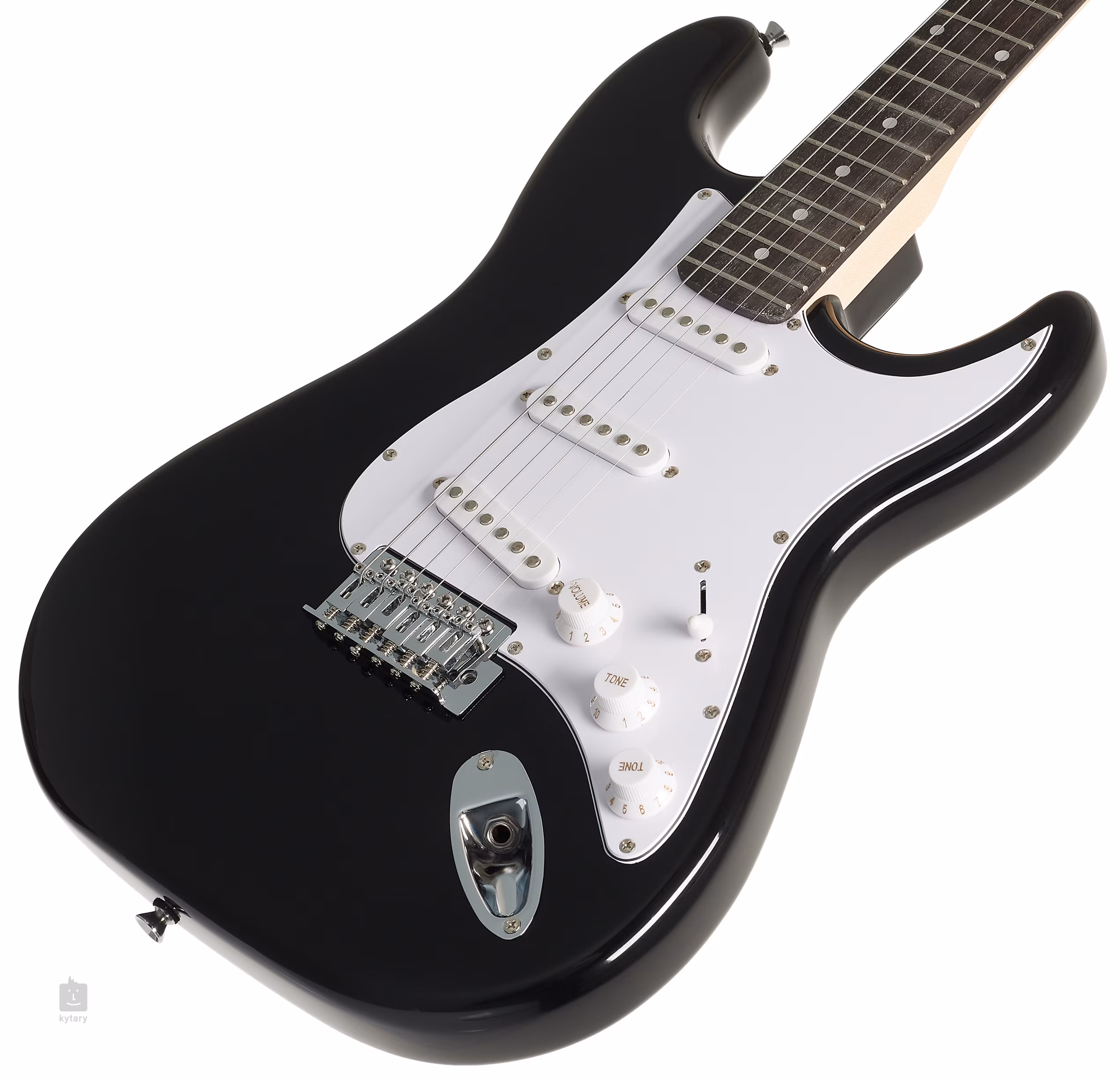 Struny są utrzymywane w odlewanych maszynkach do strojenia i zsynchronizowanym tremolo. Stylowe wykończenie podkreśla biały pickguard i chromowany osprzęt.