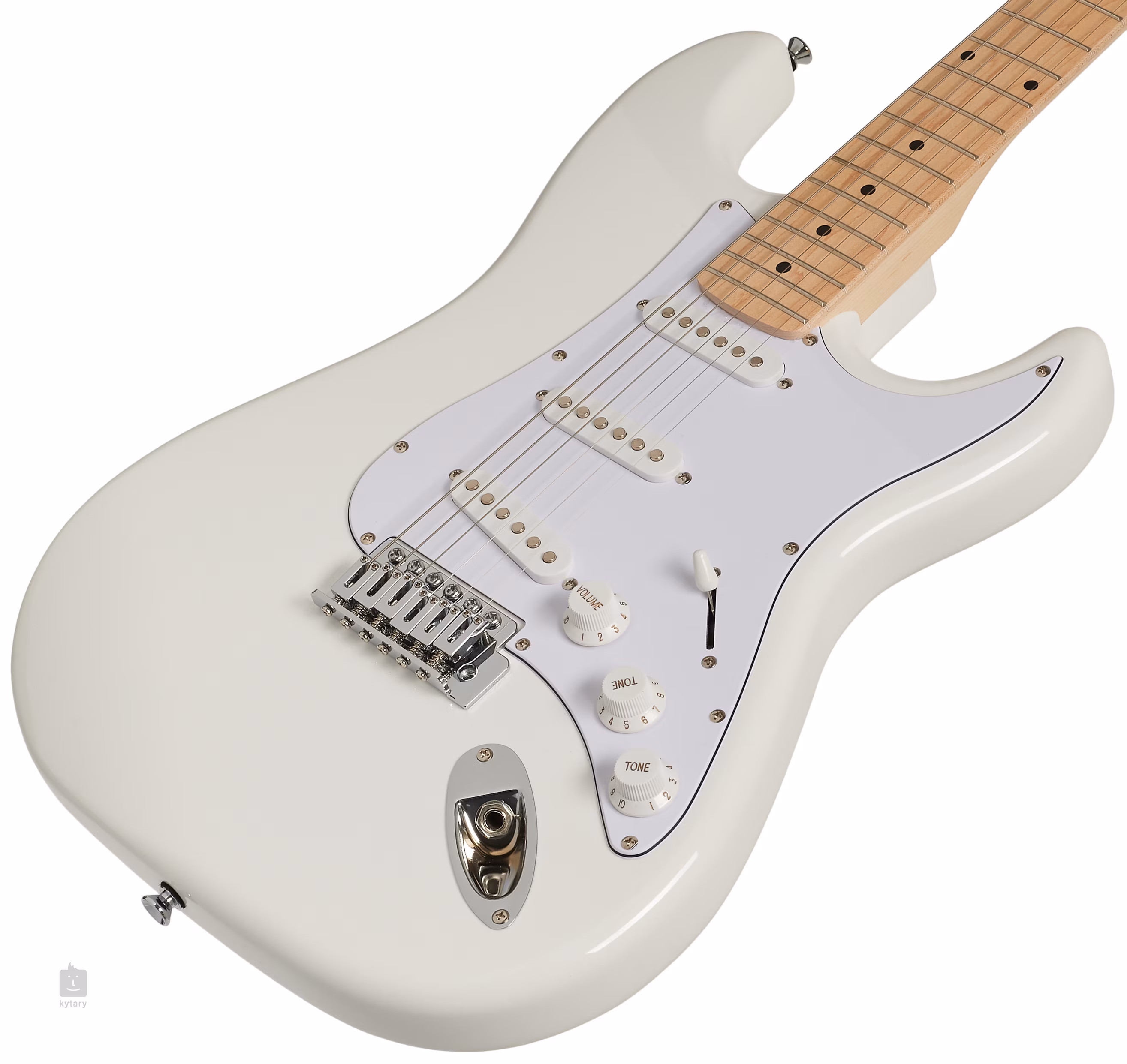 Struny są utrzymywane w odlewanych maszynkach do strojenia i zsynchronizowanym tremolo. Stylowe wykończenie podkreśla biały pickguard i chromowany osprzęt.