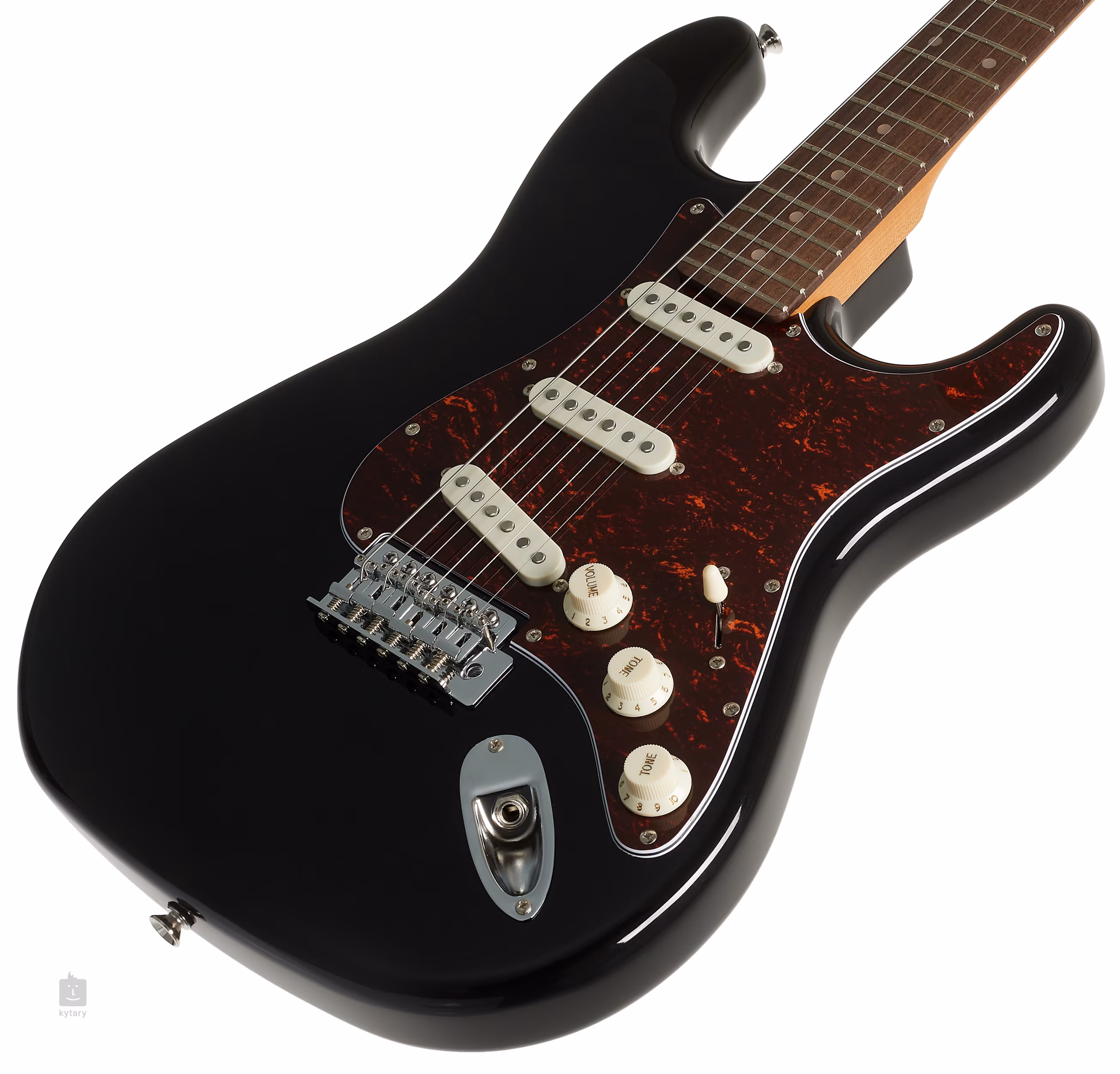 Trzy przetworniki typu single-coil z magnesami Alnico V nadają gitarze klasyczne brzmienie modeli ST. Dostosuj charakter dźwięku za pomocą membrany tonowej, głośności i pięciopozycyjnego przełącznika pickupów. Struny są zamontowane w firmowych maszynkach do strojenia i zsynchronizowanym tremolo. Stylowe wykonanie podkreśla imitacja skorupy żółwia i chromowany osprzęt.