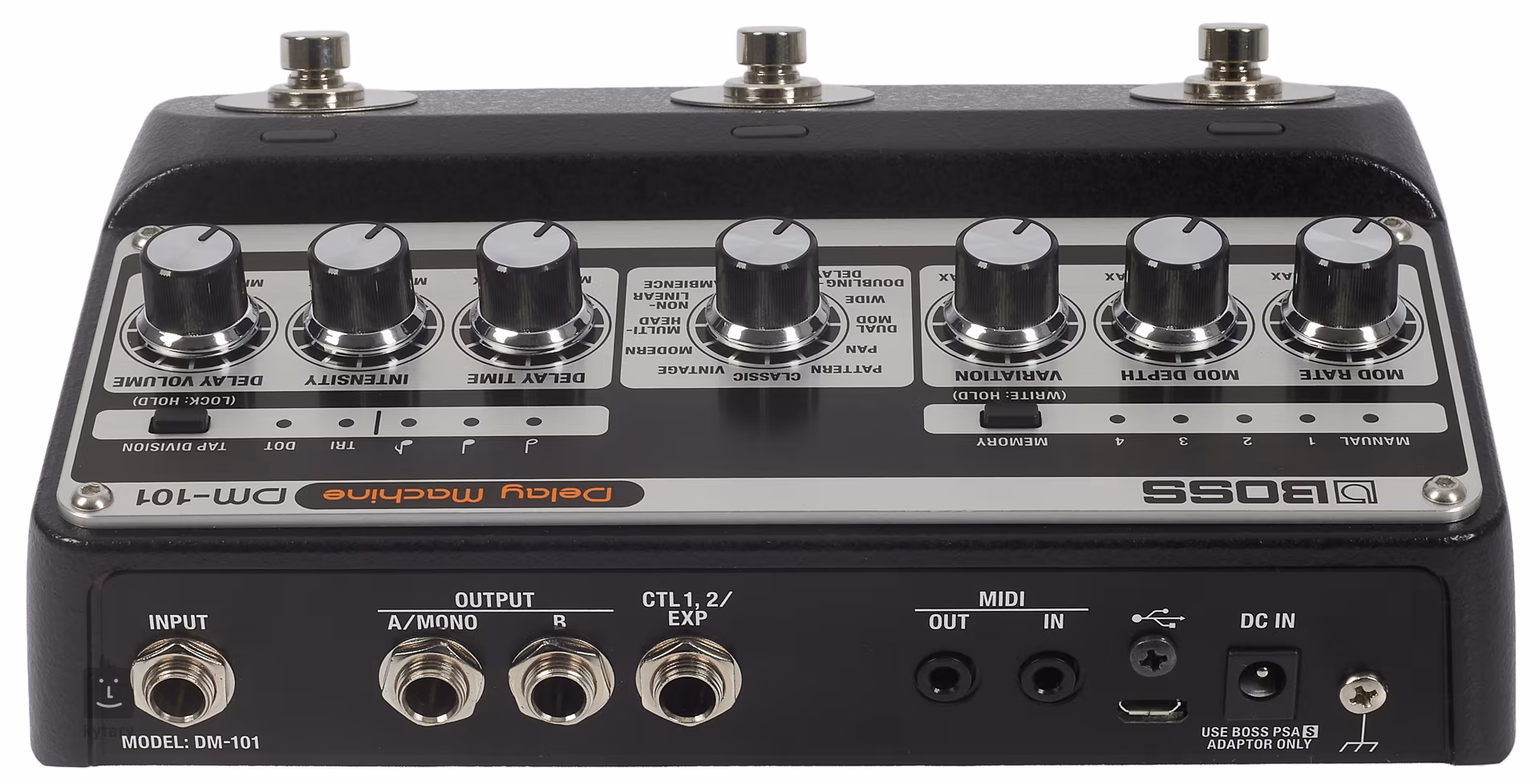 Osiem 2048-stopniowych układów BBD przesuwa granice analogowych pedałów opóźnienia pod względem czystości dźwięku, długości efektu opóźnienia (czasu opóźnienia) i całkowitej liczby dźwięków efektu opóźnienia. DM-101 oferuje zarówno ciepłe echa vintage, jak i nowoczesne analogowe opóźnienia vintage. Sześć z dwunastu typów/modów efektów oferuje tryb stereo. Poszczególne elementy sterujące regulują głośność, długość i intensywność efektu opóźnienia oraz szybkość i intensywność dodanej modulacji. Funkcja pokrętła Variation różni się w zależności od wybranego typu/trybu efektu delay. Dostępna jest również funkcja tap tempo z przełącznikiem tap division do tworzenia zaawansowanych rytmicznych efektów opóźnienia, funkcja carryover/trails, w której efekt opóźnienia pogłosi się naturalnie nawet po wyłączeniu pedału, wyjście stereo zapewniające elastyczność w routingu sygnału oraz interfejs micro USB (tylko aktualizacja).