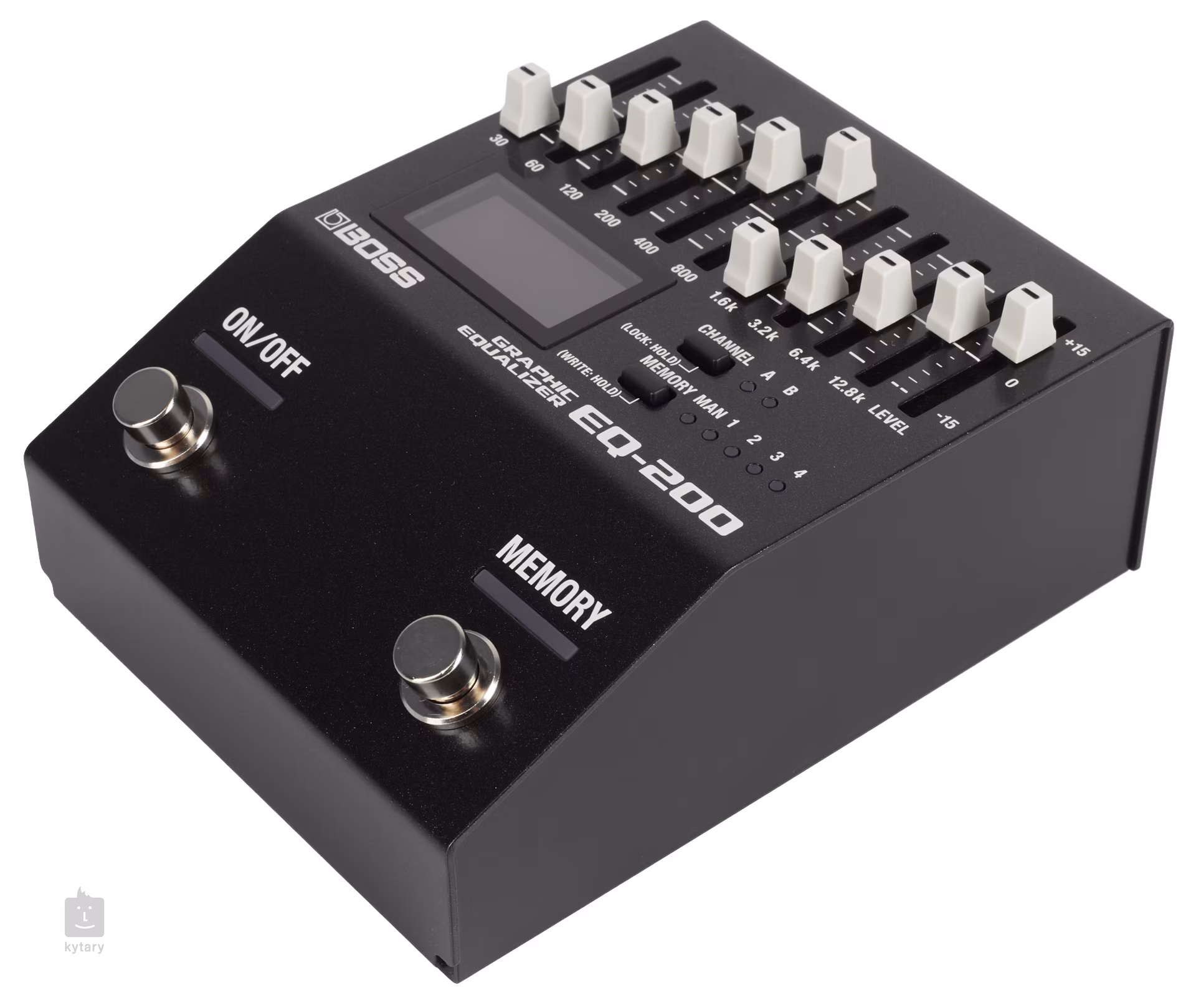 Boss EQ-200 Graphic Equalizer to niezwykle elastyczny dziesięciopasmowy dwukanałowy korektor gitarowo-basowy z graficznym wyświetlaczem pokazującym krzywą EQ. Korektor działa w zakresie od 30 Hz do 12,8 kHz i oferuje całkowicie intuicyjne sterowanie w postaci dziesięciu suwaków (wzmocnienie/tłumienie 15 dB na każdym), suwaka Master Level i przycisku Channel, który może być używany do przełączania między kanałami, podczas gdy naciśnięcie go dłużej aktywuje funkcję Panel Lock, w której "blokujesz" bieżące ustawienie (omijając suwaki).