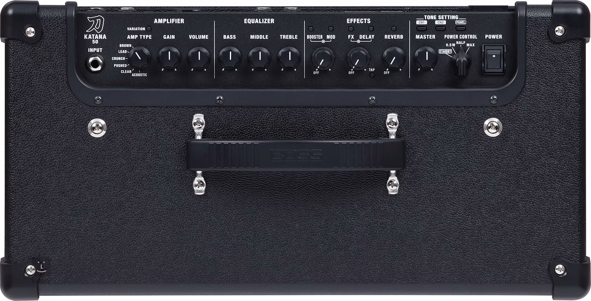 Amp Type, Gain, Volume, Bass, Middle, Treble, Booster/Mod, FX/Delay, Reverb, Master, Power Control (Standby, 0,5 W, Half, Full), Tone Setting (CH1, CH2, Panel), Variation