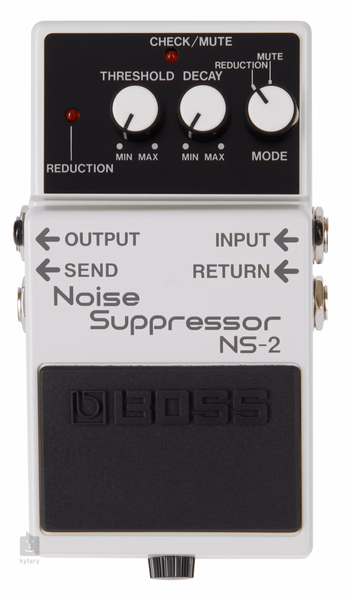 Pudełko oferuje dwa tryby (Mute i Reduction), a regulatory Threshold i Decay ustawiają poziom, przy którym zacznie działać i tłumić sygnał. Oprócz standardowego wejścia i wyjścia pedału, oferuje pętlę efektów Send/Return, w której można umieścić zewnętrzne urządzenia efektowe lub szczególnie szumiące pudełko z pedalboardu, aby skuteczniej tłumić jego hałas. Noise Suppressor, podobnie jak wszystkie obecne efekty Boss, działa w trybie Buffered Bypass. Jest zasilany baterią 9V lub adapterem 9V.