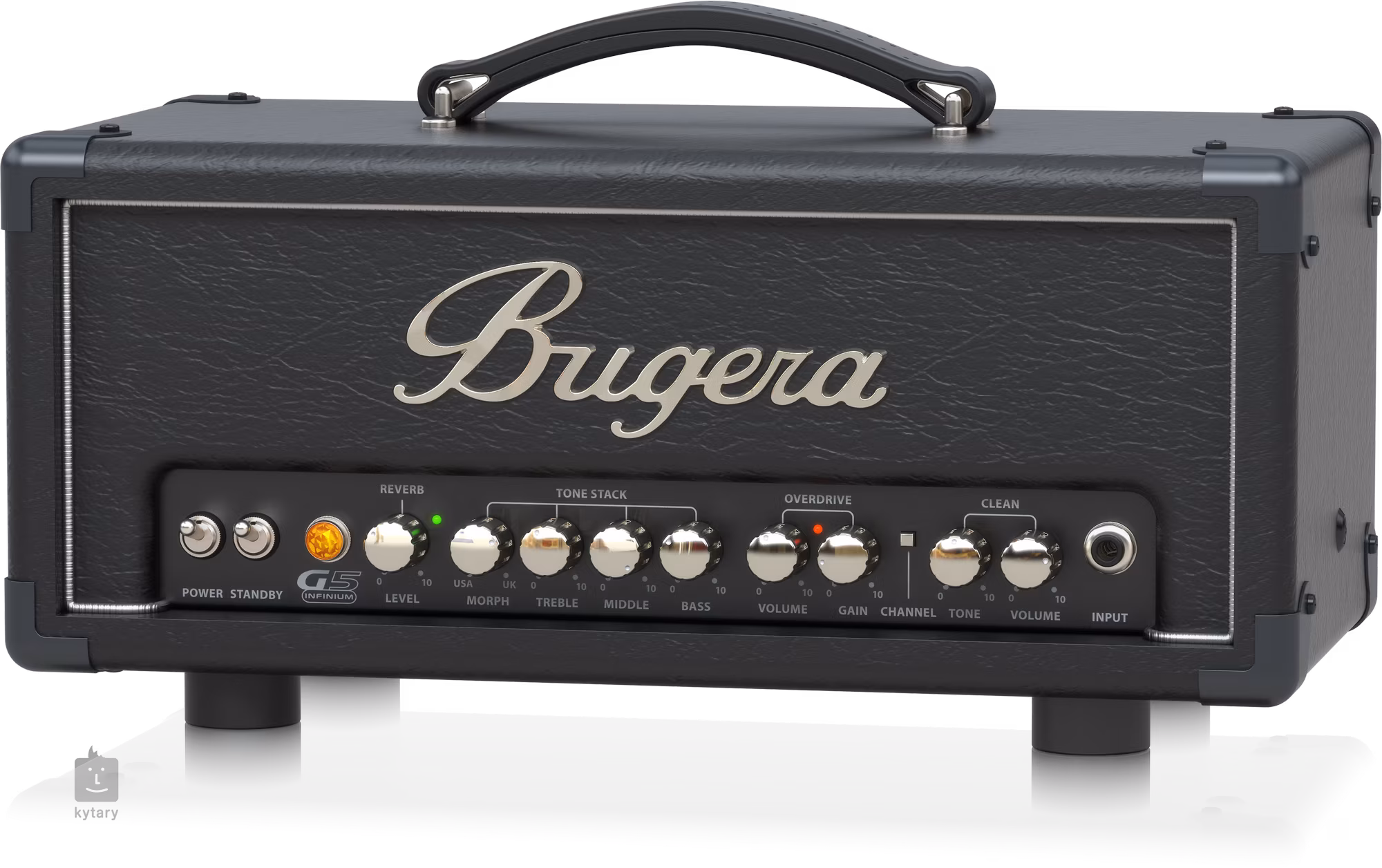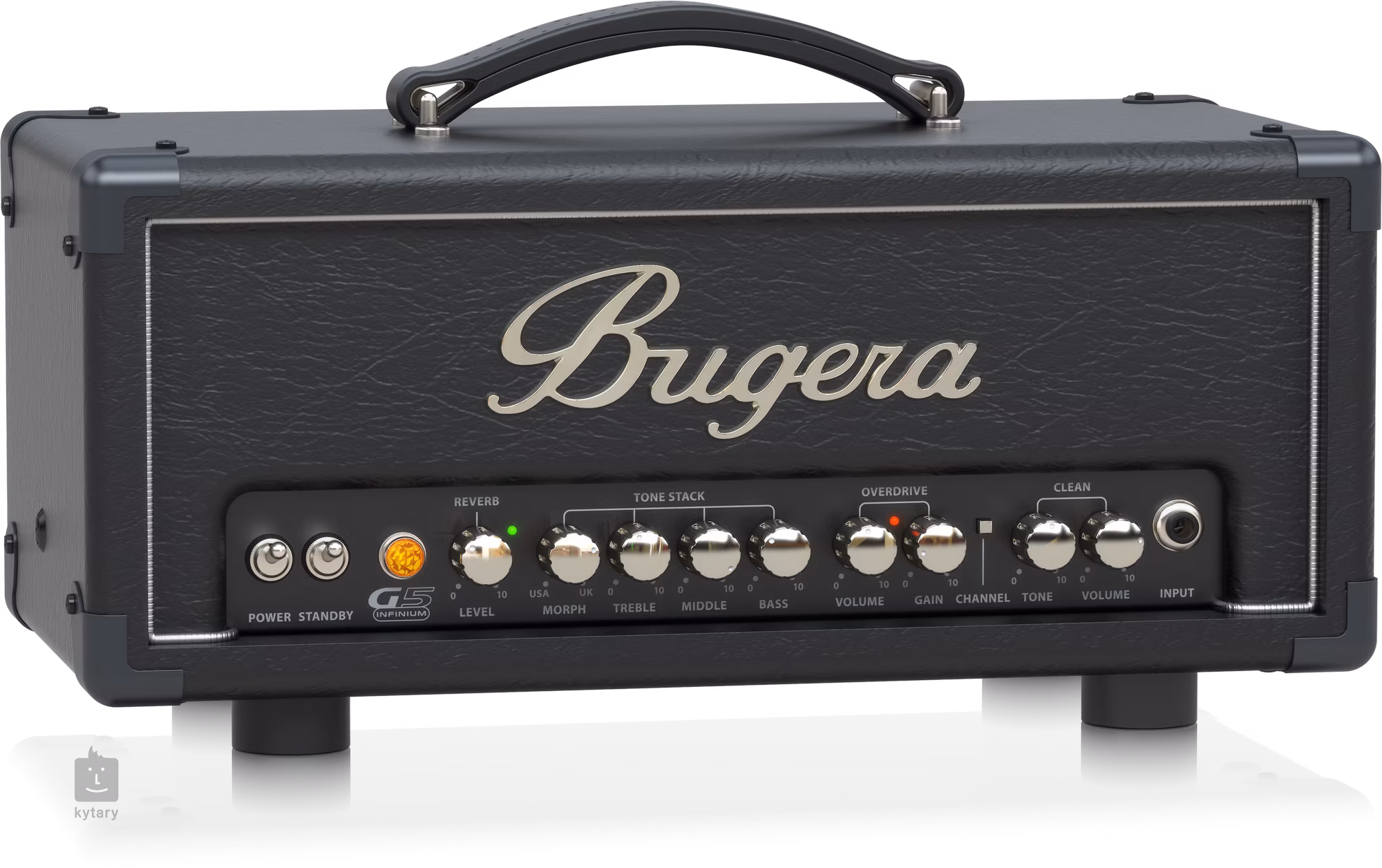 Bugera G5 INFINIUM to kompaktowy dwukanałowy lampowy wzmacniacz gitarowy klasy A z przełączaną mocą (5, 1, 0,1 W), odpowiedni do ćwiczeń w domu, jako czysty lub przesterowany / zniekształcony wzmacniacz do nagrywania. Oferuje czyste brzmienie czystego kanału, a także rockowe przesterowanie lub agresywne metalowe zniekształcenie hi-gain drugiego kanału, wbudowany efekt pogłosu, oddzielne regulatory głośności dla obu kanałów, trzypasmowy korektor dla kanału przesterowania oraz potencjometr Morph do przełączania między charakterem brzmienia instrumentów brytyjskich i amerykańskich, regulacja Tone jako korektor czystego kanału, wyjście słuchawkowe z przełączaną symulacją kabiny (1x12 lub 4x12), pętla efektów (+4 dB do użytku z procesorami efektów montowanymi w racku, -10 dB do użytku z efektami pedałowymi), wejście liniowe, wejście dla dołączonego przełącznika nożnego i wyjście głośnikowe 8 omów. Technologia INFINIUM Tube Life Multiplier wydłuża żywotność lamp końcowych nawet 20-krotnie.