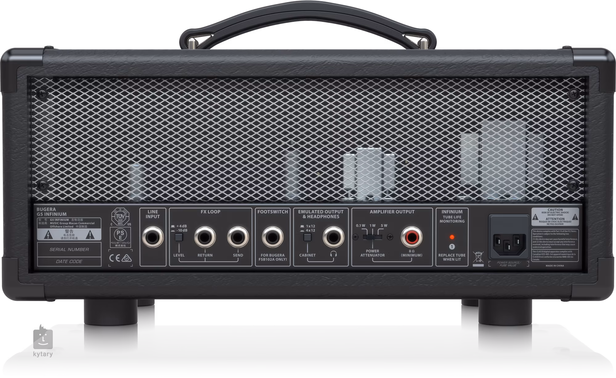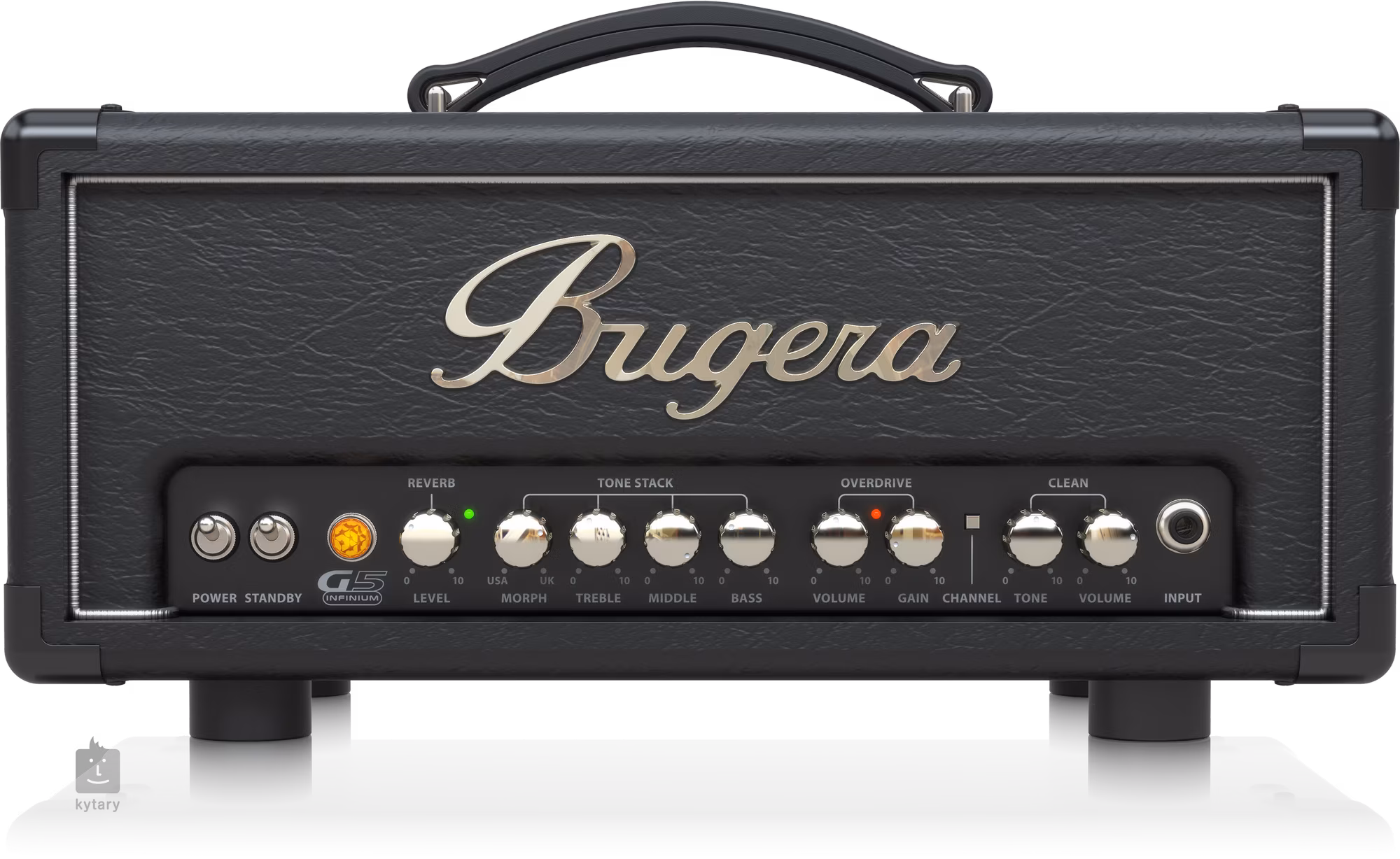 Bugera G5 INFINIUM to kompaktowy dwukanałowy lampowy wzmacniacz gitarowy klasy A z przełączaną mocą (5, 1, 0,1 W), odpowiedni do ćwiczeń w domu, jako czysty lub przesterowany / zniekształcony wzmacniacz do nagrywania. Oferuje czyste brzmienie czystego kanału, a także rockowe przesterowanie lub agresywne metalowe zniekształcenie hi-gain drugiego kanału, wbudowany efekt pogłosu, oddzielne regulatory głośności dla obu kanałów, trzypasmowy korektor dla kanału przesterowania oraz potencjometr Morph do przełączania między charakterem brzmienia instrumentów brytyjskich i amerykańskich, regulacja Tone jako korektor czystego kanału, wyjście słuchawkowe z przełączaną symulacją kabiny (1x12 lub 4x12), pętla efektów (+4 dB do użytku z procesorami efektów montowanymi w racku, -10 dB do użytku z efektami pedałowymi), wejście liniowe, wejście dla dołączonego przełącznika nożnego i wyjście głośnikowe 8 omów. Technologia INFINIUM Tube Life Multiplier wydłuża żywotność lamp końcowych nawet 20-krotnie.