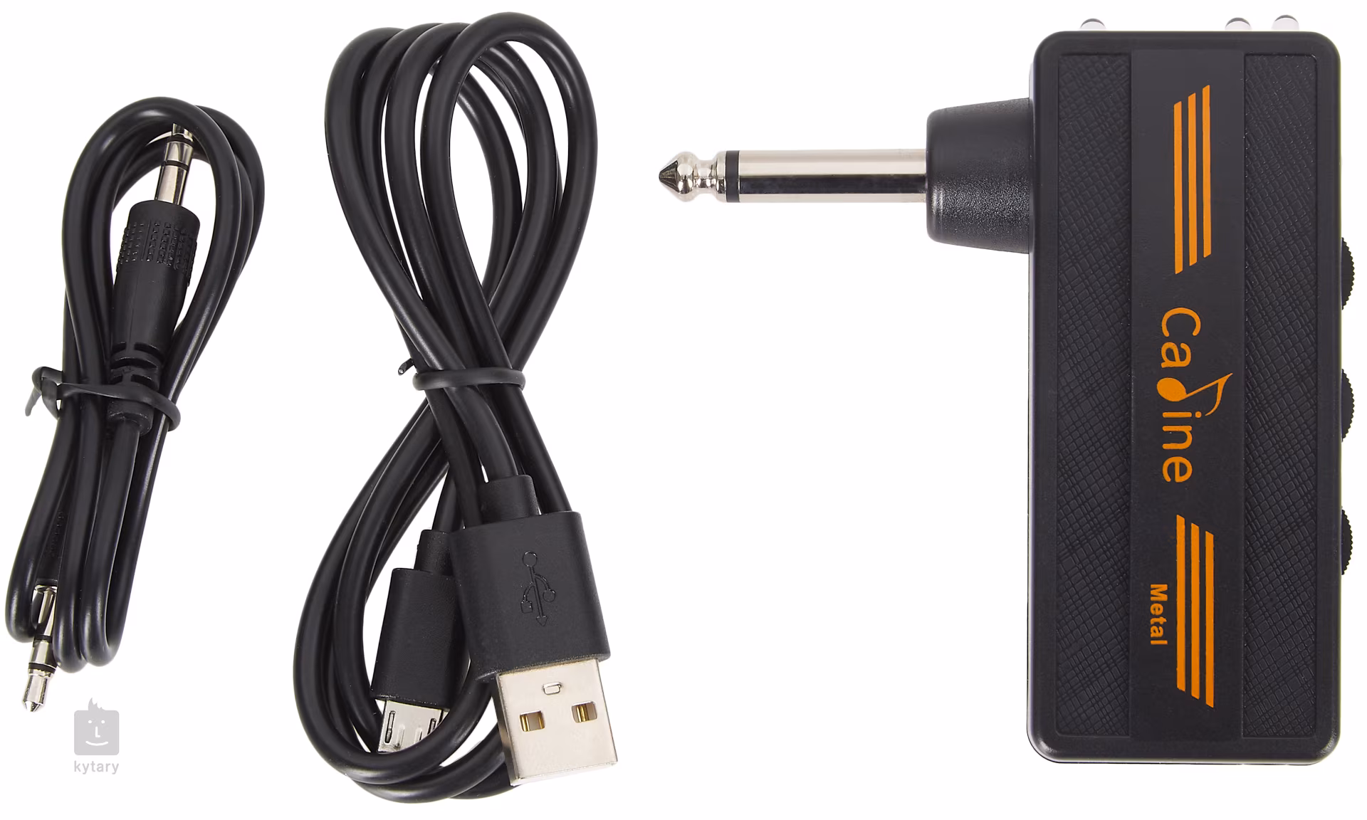 Gitarowy wzmacniacz słuchawkowy Caline z wbudowanym efektem zniekształceń, obrotowymi regulatorami głośności, korektora i zniekształceń, wejściem Aux In dla zewnętrznego dźwięku, wejściem słuchawkowym i zasilaniem akumulatorowym o żywotności do 8 godzin (ładowanie za pomocą dołączonego kabla USB).