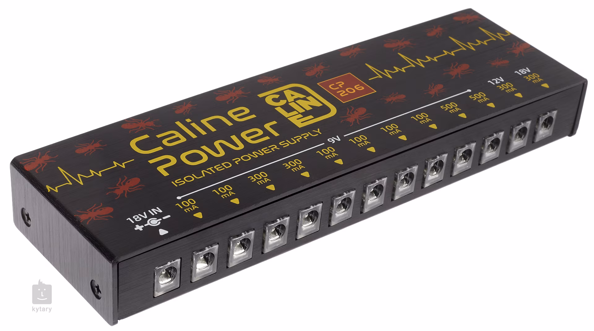 CP-206 to multi-adapter chińskiej marki Caline, który oferuje łącznie dwanaście wyjść do zasilania efektów gitarowych. Dziesięć z tych wyjść zapewnia 9V i maksymalny pobór 6x 100mA, 2x 300mA i 2x 500mA do zasilania większości popularnych efektów gitarowych. Dla bardziej wymagających pedałów dostępne jest wyjście 12V (300 mA) i wyjście 18V (300 mA). Wszystkie wyjścia są od siebie odizolowane, aby zapewnić cichą pracę bez niepożądanych szumów. Inne ważne funkcje to wskaźnik LED na każdym gnieździe zasilania i zabezpieczenie przeciwprzepięciowe, które chroni podłączone efekty pedałowe przed uszkodzeniem w przypadku zwarcia.