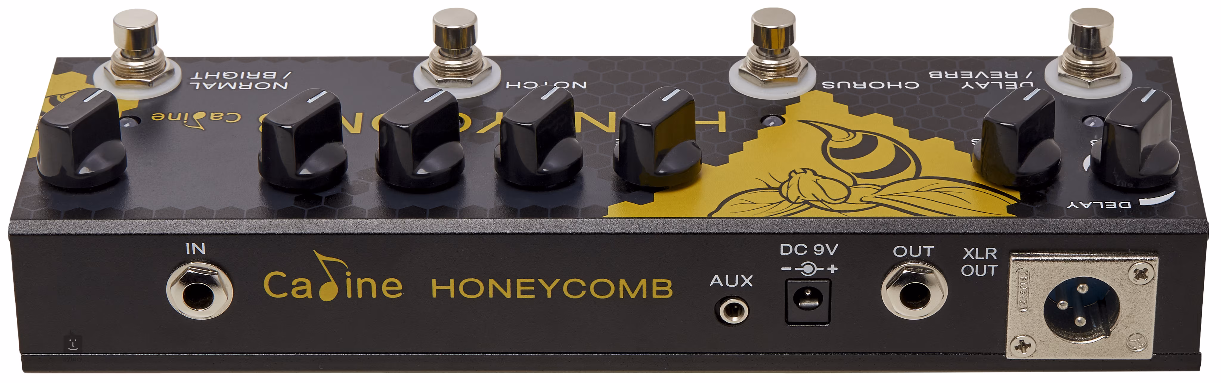 Caline CP-48 Honeycomb to multiefekt do instrumentów akustycznych/gitar chińskiej marki Caline, który w swojej obudowie oferuje trzy analogowe efekty takie jak Reverb, Delay i Chorus. Na przednim panelu znajdziemy, oprócz dwóch przełączników i kontrolek Reverb i Chorus, dwupasmowy EQ (Bass, Treble), potencjometry Volume i Gain, funkcję Notch do tłumienia efektu sprzężenia zwrotnego (częste zjawisko na instrumentach basowych) oraz przełącznik Normal/Bright, gdzie proste naciśnięcie przełącznika rozjaśnia brzmienie gitary, czyli tryb Bright działa jak Treble Boost.