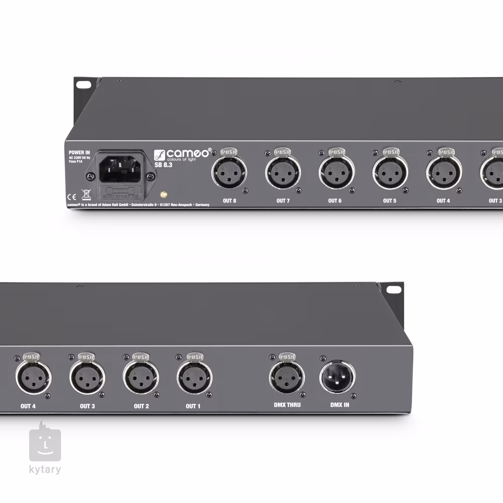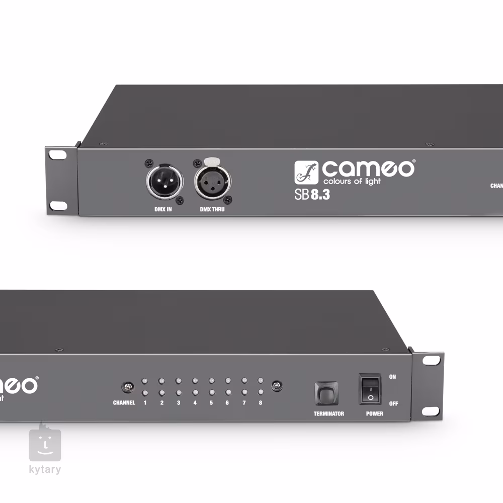 Cameo SB8.3 to 8-kanałowy dystrybutor DMX w obudowie rack 19", który umożliwia rozdzielenie sygnału DMX na 8 oddzielnych wyjść. Z przodu znajdują się równoległe złącza DMX in i DMX thru, które są zduplikowane z tyłu. Na tylnym panelu znajduje się również osiem izolowanych elektrycznie wyjść DMX (3-pinowych) do dystrybucji sygnału. Każde z wyjść jest wyposażone w diodę LED wskazującą zasilanie i obecność sygnału DMX. W zestawie znajduje się przewód zasilający.