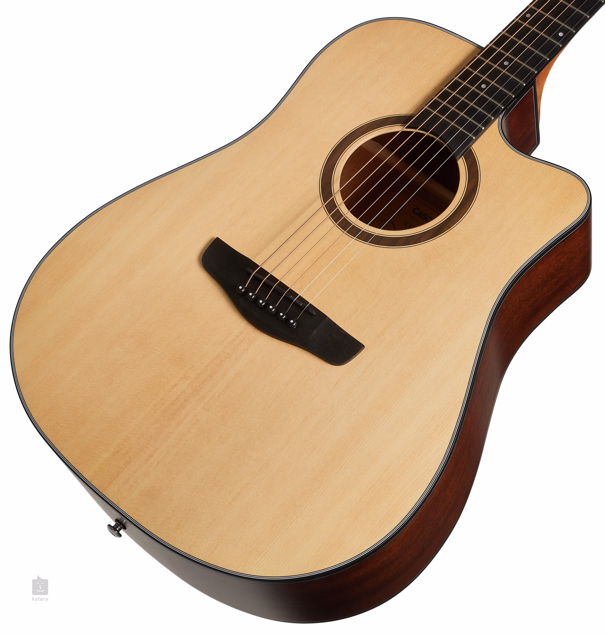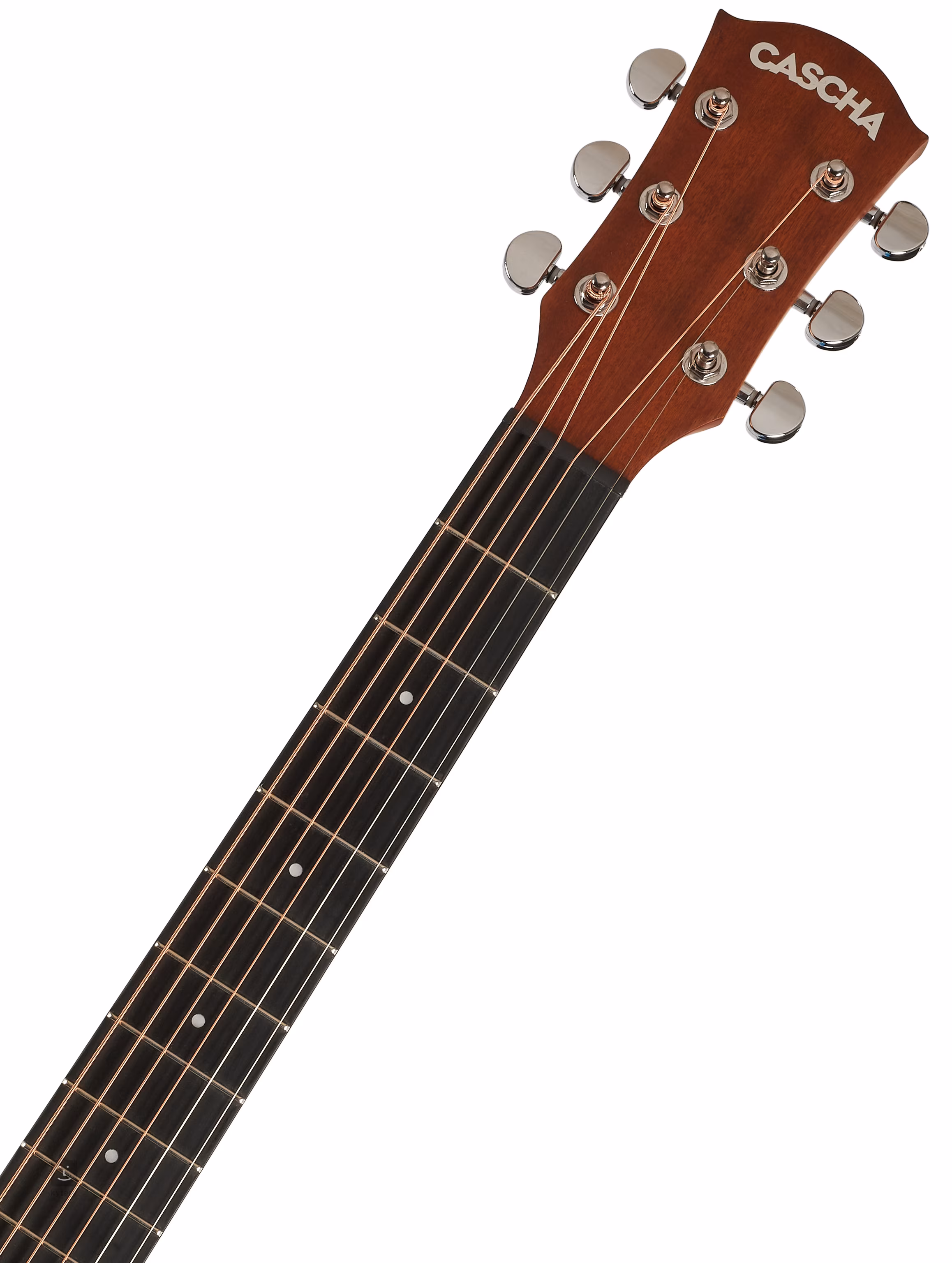 Gitara akustyczna Cascha CGA200 Stage Series Dreadnought to przystępny cenowo instrument w popularnym "zachodnim" kształcie Dreadnought, odpowiedni dla zupełnie początkujących. Przód gitary wykonany jest z laminowanego świerku, tył i boki z laminowanego mahoniu. Mahoniowa szyjka jest przyklejona do nowoczesnej kompozytowej podstrunnicy z 20 progami. Struny są zamontowane w chromowanej, odlewanej mechanice i kompozytowej główce.