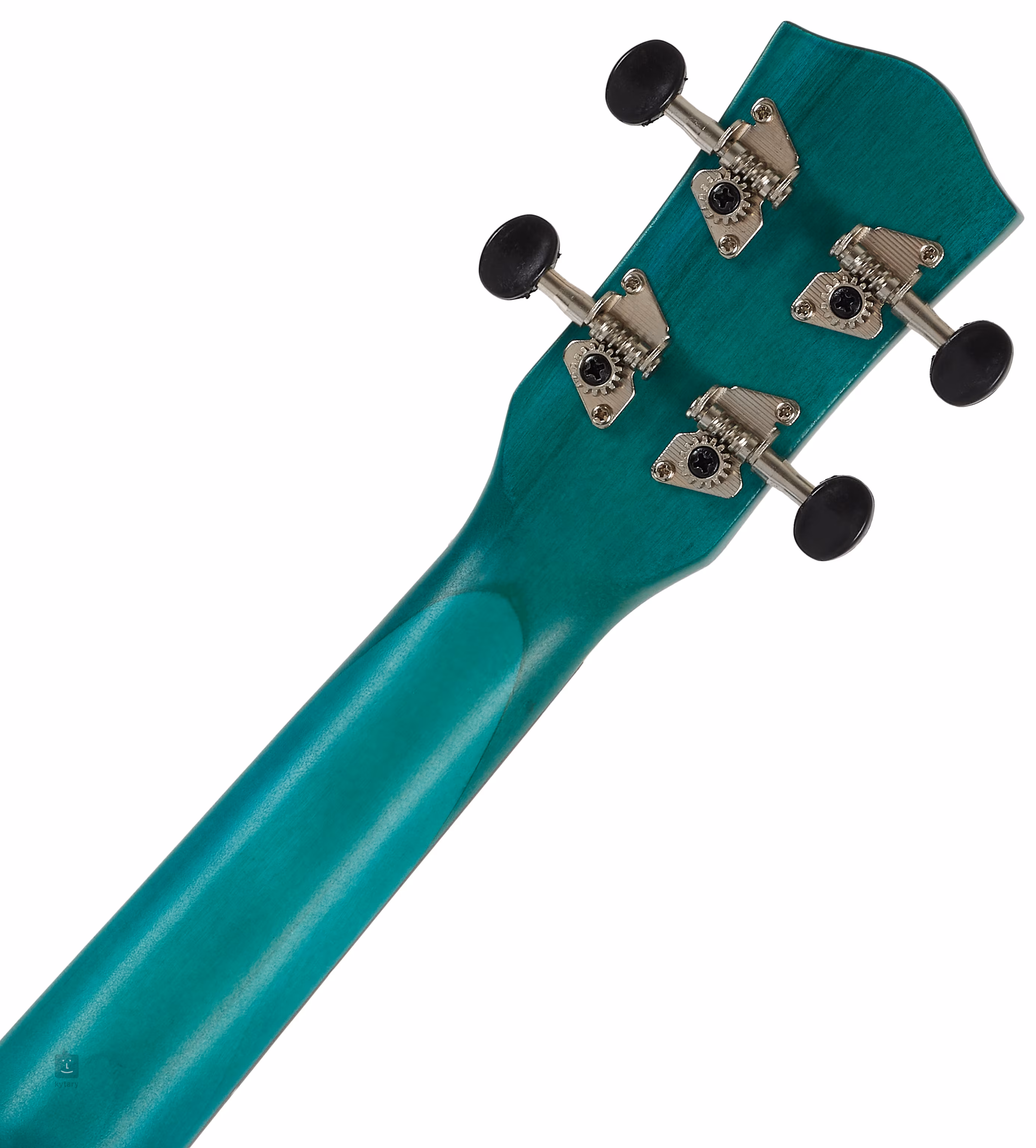 Korpus i szyjka ukulele wykonane są z drewna lipowego. Kompozytowa podstrunnica WPC podzielona jest dwunastoma progami (z tego samego materiału wykonana jest główka). Struny trzymane są w otwartych mechanizmach strojeniowych typu gitarowego. Surowy design gitary podkreśla ozdobna rozeta ze wzorem w jodełkę.